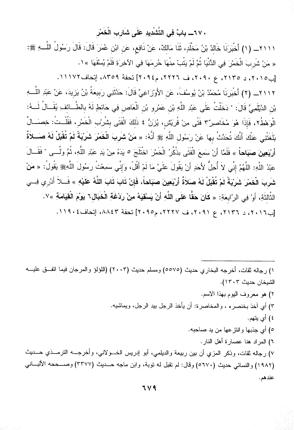 2112 - (2) أَخْبَرَنَا مُحَمَّدُ بْنُ يُوسُفَ، عَنِ الأَوْزَاعِيِّ قَالَ: حَدَّثَنِي رَبِيعَةُ بْنُ يَزِيدَ، عَنْ عَبْدِ اللَّهِ بْنِ الدَّيْلَمِيِّ قَالَ: " دَخَلْتُ عَلَى عَبْدِ اللَّهِ بْنِ عَمْرِو بْنِ الْعَاصِ فِي حَائِطٍ لَهُ بِالطَّائِفِ يُقَالُ لَهُ: الْوَهْطُ (¬2)، فَإِذَا هُوَ مُخَاصِرٌ (¬3) فَتًى مِنْ قُرَيْشٍ، يُزَنُّ (¬4) ذَلِكَ الْفَتَى بِشُرْبِ الْخَمْرِ، فَقُلْتُ: خِصَالٌ بَلَغَتْنِي عَنْكَ أَنَّكَ تُحَدِّثُ بِهَا عَنْ رَسُولِ اللَّهِ - صلى الله عليه وسلم - أَنَّهُ: «مَنْ شَرِبَ الْخَمْرَ شَرْبَةً لَمْ تُقْبَلْ لَهُ صَلاَةٌ أَرْبَعِينَ صَبَاحاً» فَلَمَّا أَنْ سَمِعَ الْفَتَى بذْكُرُ الْخَمْرَ اخْتَلَجَ (¬5) يَدَهُ مِنْ يَدِ عَبْدِ اللَّهِ، ثُمَّ وَلَّى " فَقَالَ عَبْدُ اللَّهِ: اللَّهُمَّ إِنِّي لاَ أُحِلُّ لأَحَدٍ أَنْ يَقُولَ عَلَيَّ مَا لَمْ أَقُلْ، وَإِنِّي سَمِعْتُ رَسُولَ اللَّهِ - صلى الله عليه وسلم - يَقُولُ: «مَنْ شَرِبَ الْخَمْرَ شَرْبَةً لَمْ تُقْبَلْ لَهُ صَلاَةٌ أَرْبَعِينَ صَبَاحاً، فَإِنْ تَابَ تَابَ اللَّهُ عَلَيْهِ» فَلاَ أَدْرِي فِي الثَّالِثَةِ، أَوْ فِي الرَّابِعَةِ: «كَانَ حَقًّا عَلَى اللَّهِ أَنْ يَسْقِيَهُ مِنْ رَدْغَةِ الْخَبَالِ (¬6) يَوْمَ الْقِيَامَةِ» (¬7).