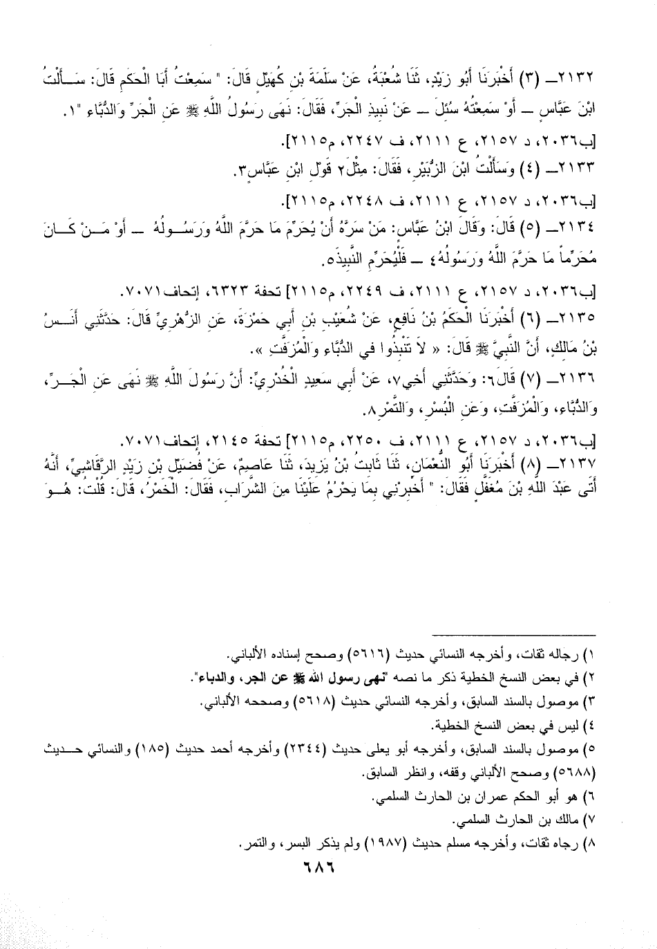 2132 - (3) أَخْبَرَنَا أَبُو زَيْدٍ، ثَنَا شُعْبَةُ، عَنْ سَلَمَةَ بْنِ كُهَيْلٍ قَالَ: " سَمِعْتُ أَبَا الْحَكَمِ قَالَ: سَأَلْتُ ابْنَ عَبَّاسٍ - أَوْ سَمِعْتُهُ سُئِلَ - عَنْ نَبِيذِ الْجَرِّ، فَقَالَ: نَهَى رَسُولُ اللَّهِ - صلى الله عليه وسلم - عَنِ الْجَرِّ وَالدُّبَّاءِ " (¬1).