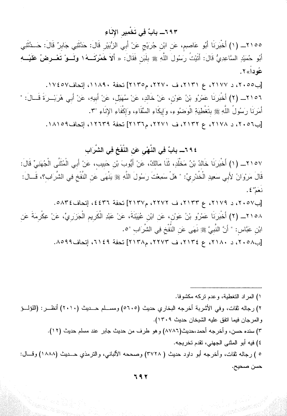 2155 - (1) أَخْبَرَنَا أَبُو عَاصِمٍ، عَنِ ابْنِ جُرَيْجٍ عَنْ أَبِي الزُّبَيْرِ قَالَ: حَدَّثَنِي جَابِرٌ قَالَ: حَدَّثَنِي أَبُو حُمَيْدٍ السَّاعِدِيُّ قَالَ: أَتَيْتُ رَسُولَ اللَّهِ - صلى الله عليه وسلم - بِلَبَنٍ فَقَالَ: «أَلاَ خَمَّرْتَهُ (¬1) وَلَوْ تَعْرِضُ عَلَيْهِ عُوداً» (¬2).