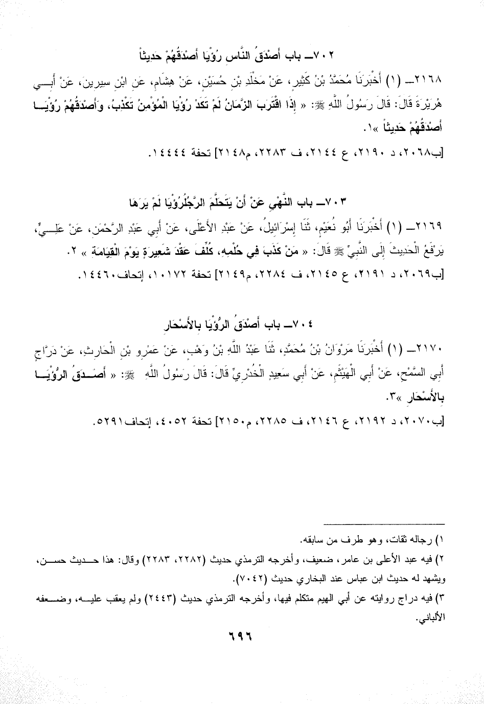 2170 - (1) أَخْبَرَنَا مَرْوَانُ بْنُ مُحَمَّدٍ، ثَنَا عَبْدُ اللَّهِ بْنُ وَهْبٍ، عَنْ عَمْرِو بْنِ الْحَارِثِ، عَنْ دَرَّاجٍ أَبِي السَّمْحِ، عَنْ أَبِي الْهَيْثَمِ، عَنْ أَبِي سَعِيدٍ الْخُدْرِيِّ قَالَ: قَالَ رَسُولُ اللَّهِ - صلى الله عليه وسلم -: «أَصْدَقُ الرُّؤْيَا بِالأَسْحَارِ» (¬3).