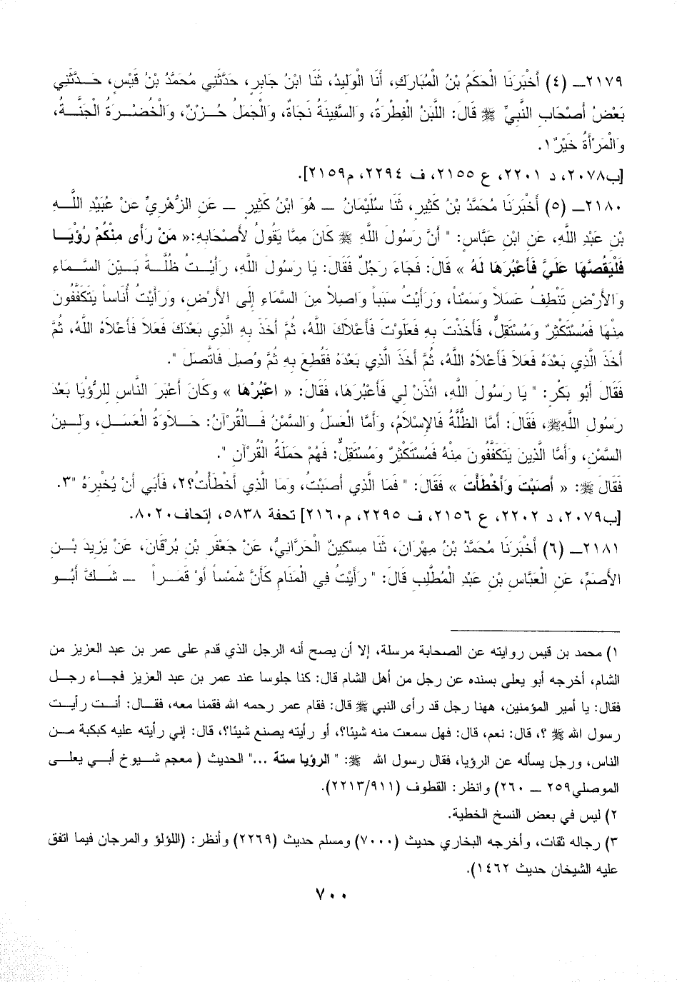 2180 - (5) أَخْبَرَنَا مُحَمَّدُ بْنُ كَثِيرٍ، ثَنَا سُلَيْمَانُ - هُوَ ابْنُ كَثِيرٍ - عَنِ الزُّهْرِيِّ عَنْ عُبَيْدِ اللَّهِ بْنِ عَبْدِ اللَّهِ، عَنِ ابْنِ عَبَّاسٍ: " أَنَّ رَسُولَ اللَّهِ - صلى الله عليه وسلم - كَانَ مِمَّا يَقُولُ لأَصْحَابِهِ: «مَنْ رَأَى مِنْكُمْ رُؤْيَا فَلْيَقُصَّهَا عَلَيَّ فَأَعْبُرَهَا لَهُ» قَالَ: فَجَاءَ رَجُلٌ فَقَالَ: يَا رَسُولَ اللَّهِ، رَأَيْتُ ظُلَّةً بَيْنَ السَّمَاءِ وَالأَرْضِ تَنْطِفُ عَسَلاً وَسَمْناً، وَرَأَيْتُ سَبَباً وَاصِلاً مِنَ السَّمَاءِ إِلَى الأَرْضِ، وَرَأَيْتُ أُنَاساً يَتَكَفَّفُونَ مِنْهَا فَمُسْتَكْثِرٌ وَمُسْتَقِلٌّ، فَأَخَذْتَ بِهِ فَعَلَوْتَ فَأَعْلاَكَ اللَّهُ، ثُمَّ أَخَذَ بِهِ الَّذِي بَعْدَكَ فَعَلاَ فَأَعْلاَهُ اللَّهُ، ثُمَّ أَخَذَ الَّذِي بَعْدَهُ فَعَلاَ فَأَعْلاَهُ اللَّهُ، ثُمَّ أَخَذَ الَّذِي بَعْدَهُ فَقُطِعَ بِهِ ثُمَّ وُصِلَ فَاتَّصَلَ ".