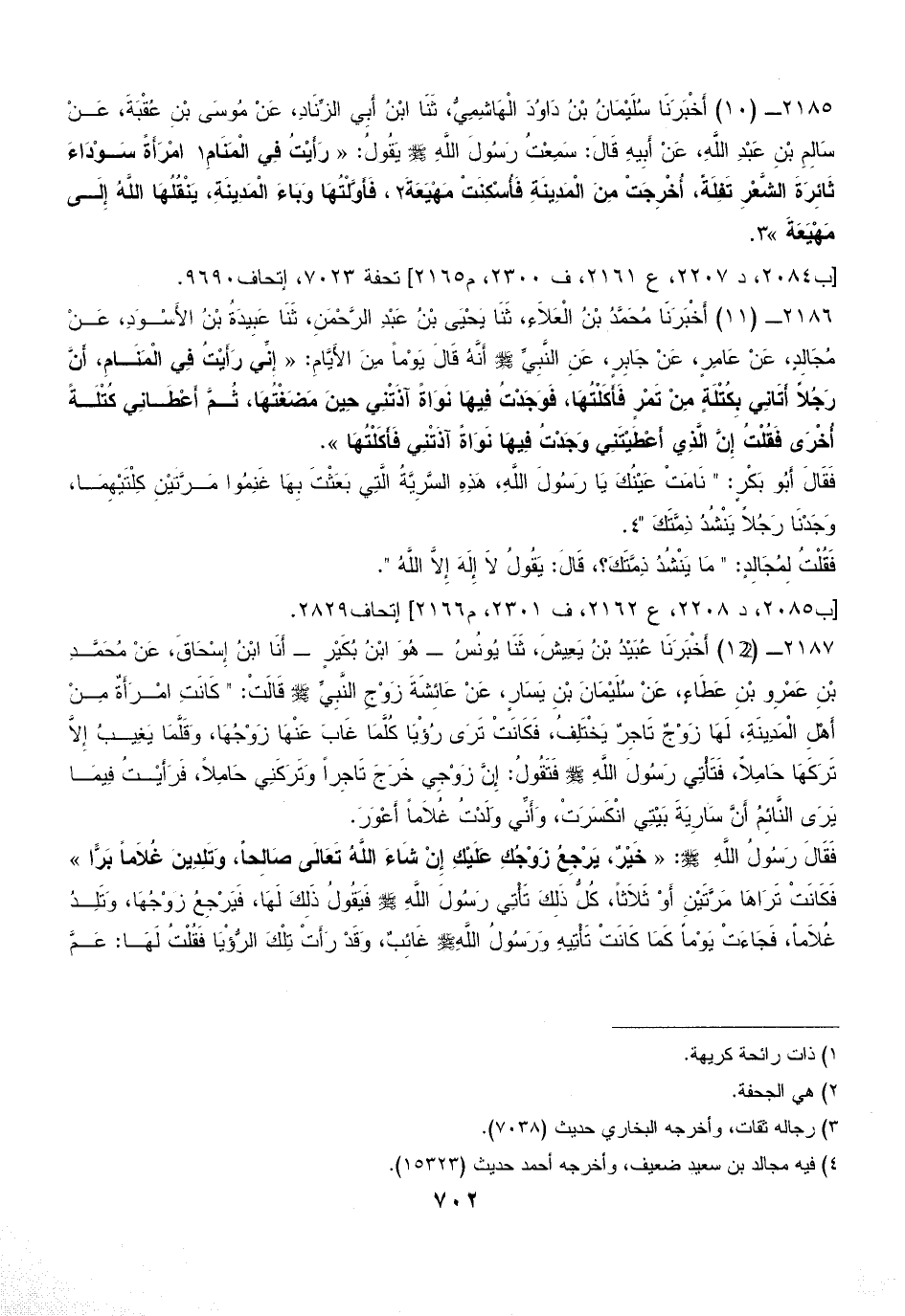 2185 - (10) أَخْبَرَنَا سُلَيْمَانُ بْنُ دَاوُدَ الْهَاشِمِيُّ، ثَنَا ابْنُ أَبِي الزِّنَادِ، عَنْ مُوسَى بْنِ عُقْبَةَ، عَنْ سَالِمِ بْنِ عَبْدِ اللَّهِ، عَنْ أَبِيهِ قَالَ: سَمِعْتُ رَسُولَ اللَّهِ - صلى الله عليه وسلم - يَقُولُ: «رَأَيْتُ فِي الْمَنَامِ (¬1) امْرَأَةً سَوْدَاءَ ثَائِرَةَ الشَّعْرِ تَفِلَةً، أُخْرِجَتْ مِنَ الْمَدِينَةِ فَأُسْكِنَتْ مَهْيَعَةَ (¬2)، فَأَوَّلْتُهَا وَبَاءَ الْمَدِينَةِ، يَنْقُلُهَا اللَّهُ إِلَى مَهْيَعَةَ» (¬3).