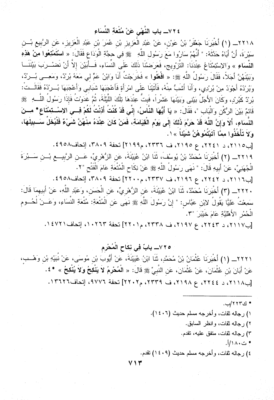 2218 - (1) أَخْبَرَنَا جَعْفَرُ بْنُ عَوْنٍ، عَنْ عَبْدِ الْعَزِيزِ بْنِ عُمَرَ بْنِ عَبْدِ الْعَزِيزِ، عَنِ الرَّبِيعِ بْنِ سَبْرَةَ، أَنَّ أَبَاهُ حَدَّثَهُ: " أَنَّهُمْ سَارُوا مَعَ رَسُولِ اللَّهِ - صلى الله عليه وسلم - فِي حِجَّةِ الْوَدَاعِ فَقَالَ: «اسْتَمْتِعُوا مِنْ هَذِهِ النِّسَاءِ» وَالاِسْتِمْتَاعُ عِنْدَنَا: التَّزْوِيج، فَعَرَضْنَا ذَلِكَ عَلَى النِّسَاءِ، فَأَبَيْنَ إِلاَّ أَنْ نَضْرَبَ بَيْنَنَا وَبَيْنَهُنَّ أَجَلاً، فَقَالَ رَسُولُ اللَّهِ - صلى الله عليه وسلم -: «افْعَلُوا» فَخَرَجْتُ أَنَا وَابْنُ عَمٍّ لِي مَعَهُ بُرْدٌ، وَمَعِى بُرْدٌ، وَبُرْدُهُ أَجْوَدُ مِنْ بُرْدِي، وَأَنَا أَشَبُّ مِنْهُ، فَأَتَيْنَا عَلَى امْرَأَةٍ فَأَعْجَبَهَا شَبَابِي وَأَعْجَبَهَا بُرْدُهُ فَقَالَتْ: بُرْدٌ كَبُرْدٍ، وَكَانَ الأَجَلُ بَيْنِى وَبَيْنَهَا عَشْراً، فَبِتُّ عِنْدَهَا تِلْكَ اللَّيْلَةَ، ثُمَّ غَدَوْتُ فَإِذَا رَسُولُ اللَّهِ - صلى الله عليه وسلم - قَائِمٌ بَيْنَ الرُّكْنِ وَالْبَابِ "، فَقَالَ: «يَا أَيُّهَا النَّاسُ، إِنِّي قَدْ كُنْتُ أَذِنْتُ لَكُمْ فِي الاِسْتِمْتَاعِ* مِنَ النِّسَاءِ، أَلاَ وَإِنَّ اللَّهَ قَدْ حَرَّمَ ذَلِكَ إِلَى يَوْمِ الْقِيَامَةِ، فَمَنْ كَانَ عِنْدَهُ مِنْهُنَّ شَيْءٌ فَلْيُخَلِّ سَبِيلَهَا، وَلاَ تَأْخُذُوا مِمَّا آتَيْتُمُوهُنَّ شَيْئاً» (¬1).