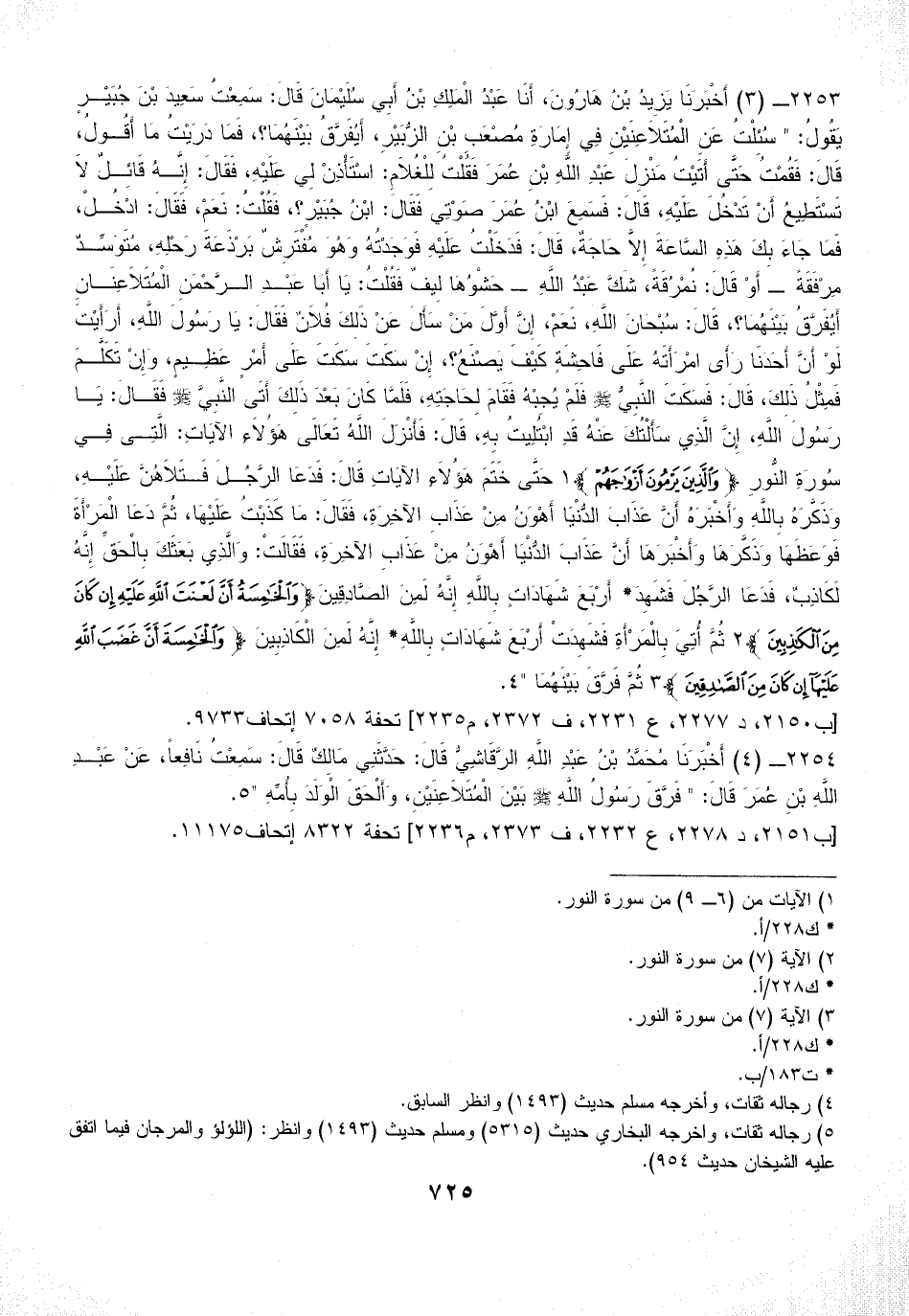 2253 - (3) أَخْبَرَنَا يَزِيدُ بْنُ هَارُونَ، أَنَا عَبْدُ الْمَلِكِ بْنُ أَبِي سُلَيْمَانَ قَالَ: سَمِعْتُ سَعِيدَ بْنَ جُبَيْرٍ يَقُولُ: " سُئِلْتُ عَنِ الْمُتَلاَعِنَيْنِ فِي إِمَارَةِ مُصْعَبِ بْنِ الزُّبَيْرِ، أَيُفَرَّقُ بَيْنَهُمَا؟ ، فَمَا دَرَيْتُ مَا أَقُولُ، قَالَ: فَقُمْتُ حَتَّى أَتَيْتُ مَنْزِلَ عَبْدِ اللَّهِ بْنِ عُمَرَ فَقُلْتُ لِلْغُلاَمِ: اسْتَأْذِنْ لِي عَلَيْهِ، فَقَالَ: إِنَّهُ قَائِلٌ لاَ تَسْتَطِيعُ أَنْ تَدْخُلَ عَلَيْهِ، قَالَ: فَسَمِعَ ابْنُ عُمَرَ صَوْتِي فَقَالَ: ابْنُ جُبَيْرٍ؟ ، فَقُلْتُ: نَعَمْ، فَقَالَ: ادْخُلْ، فَمَا جَاءَ بِكَ هَذِهِ السَّاعَةَ إِلاَّ حَاجَةٌ، قَالَ: فَدَخَلْتُ عَلَيْهِ فَوَجَدْتُهُ وَهُوَ مُفْتَرِشٌ بَرْذَعَةَ رَحْلِهِ، مُتَوَسِّدٌ مِرْفَقَةً - أَوْ قَالَ: نُمْرُقَةً، شَكَّ عَبْدُ اللَّهِ - حَشْوُهَا لِيفٌ فَقُلْتُ: يَا أَبَا عَبْدِ الرَّحْمَنِ الْمُتَلاَعِنَانِ أَيُفَرَّقُ بَيْنَهُمَا؟ ، قَالَ: سُبْحَانَ اللَّهِ، نَعَمْ، إِنَّ أَوَّلَ مَنْ سَأَلَ عَنْ ذَلِكَ فُلاَنٌ فَقَالَ: يَا رَسُولَ اللَّهِ، أَرَأَيْتَ لَوْ أَنَّ أَحَدَنَا رَأَى امْرَأَتَهُ عَلَى فَاحِشَةٍ كَيْفَ يَصْنَعُ؟ ، إِنْ سَكَتَ سَكَتَ عَلَى أَمْرٍ عَظِيمٍ، وَإِنْ تَكَلَّمَ فَمِثْلُ ذَلِكَ، قَالَ: فَسَكَتَ النَّبِيُّ - صلى الله عليه وسلم - فَلَمْ يُجِبْهُ فَقَامَ لِحَاجَتِهِ، فَلَمَّا كَانَ بَعْدَ ذَلِكَ أَتَى النَّبِيَّ - صلى الله عليه وسلم - فَقَالَ: يَا رَسُولَ اللَّهِ، إِنَّ الَّذِي سَأَلْتُكَ عَنْهُ قَدِ ابْتُلِيتُ بِهِ، قَالَ: فَأَنْزَلَ اللَّهُ تَعَالَى هَؤُلاَءِ الآيَاتِ: الَّتِى فِي سُورَةِ النُّورِ {وَالَّذِينَ يَرْمُونَ أَزْوَاجَهُمْ} (¬1) حَتَّى خَتَمَ هَؤُلاَءِ الآيَاتِ قَالَ: فَدَعَا الرَّجُلَ فَتَلاَهُنَّ عَلَيْهِ، وَذَكَّرَهُ بِاللَّهِ وَأَخْبَرَهُ أَنَّ عَذَابَ الدُّنْيَا أَهْوَنُ مِنْ عَذَابِ الآخِرَةِ، فَقَالَ: مَا كَذَبْتُ عَلَيْهَا، ثُمَّ دَعَا الْمَرْأَةَ فَوَعَظَهَا وَذَكَّرَهَا وَأَخْبَرَهَا أَنَّ عَذَابَ الدُّنْيَا أَهْوَنُ مِنْ عَذَابِ الآخِرَةِ، فَقَالَتْ: وَالَّذِي بَعَثَكَ بِالْحَقِّ إِنَّهُ لَكَاذِبٌ، فَدَعَا الرَّجُلَ فَشَهِدَ* أَرْبَعَ شَهَادَاتٍ بِاللَّهِ إِنَّهُ لَمِنَ الصَّادِقِينَ {وَالْخَامِسَةُ أَنَّ لَعْنَتَ اللَّهِ عَلَيْهِ إِنْ كَانَ مِنَ الْكَاذِبِينَ} (¬2) ثُمَّ أُتِيَ بِالْمَرْأَةِ فَشَهِدَتْ أَرْبَعَ شَهَادَاتٍ بِاللَّهِ* إِنَّهُ لَمِنَ الْكَاذِبِينَ {وَالْخَامِسَةَ أَنَّ غَضَبَ اللَّهِ عَلَيْهَا إِنْ كَانَ مِنَ الصَّادِقِينَ} (¬3) ثُمَّ فَرَّقَ بَيْنَهُمَا " (¬4).