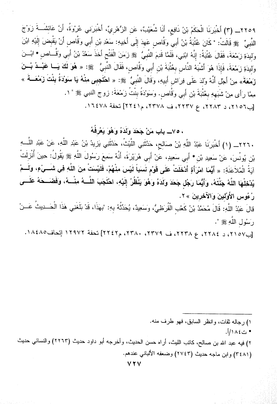 2259 - (3) أَخْبَرَنَا الْحَكَمُ بْنُ نَافِعٍ، أَنَا شُعَيْبٌ، عَنِ الزُّهْرِيِّ، أَخْبَرَنِي عُرْوَةُ، أَنَّ عَائِشَةَ زَوْجَ النَّبِيِّ - صلى الله عليه وسلم - قَالَتْ: " كَانَ عُتْبَةُ بْنُ أَبِي وَقَّاصٍ عَهِدَ إِلَى أَخِيهِ: سَعْدِ بْنِ أَبِي وَقَّاصٍ أَنْ يَقْبِضَ إِلَيْهِ ابْنَ وَلِيدَةِ زَمْعَةَ، فَقَالَ عُتْبَةُ: إِنَّهُ ابْنِي، فَلَمَّا قَدِمَ النَّبِيُّ - صلى الله عليه وسلم - زَمَنَ الْفَتْحِ أَخَذَ سَعْدُ بْنُ أَبِي وَقَّاصٍ* ابْنَ وَلِيدَةِ زَمْعَةَ، فَإِذَا هُوَ أَشْبَهُ النَّاسِ بِعُتْبَةَ بْنِ أَبِي وَقَّاصٍ، فَقَالَ النَّبِيُّ - صلى الله عليه وسلم -: «هُوَ لَكَ يَا عَبْدُ بْنَ زَمْعَةَ» مِنْ أَجْلِ أَنَّهُ وُلِدَ عَلَى فِرَاشِ أَبِيهِ، وَقَالَ النَّبِيُّ - صلى الله عليه وسلم -: «احْتَجِبِى مِنْهُ يَا سَوْدَةُ بِنْتَ زَمْعَةَ» مِمَّا رَأَى مِنْ شَبَهِهِ بِعُتْبَةَ بْنِ أَبِي وَقَّاصٍ. وَسَوْدَةُ بِنْتُ زَمْعَةَ: زوج النبي - صلى الله عليه وسلم - " (¬1).