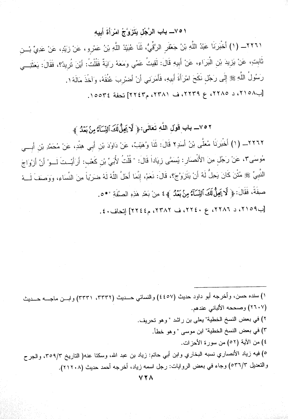 2262 - (1) أَخْبَرَنَا مُعَلَّى بْنُ أَسَدٍ (¬2) قَالَ: ثَنَا وُهَيْبٌ، عَنْ دَاوُدَ بْنِ أَبِي هِنْدٍ، عَنْ مُحَمَّدِ بْنِ أَبِي مُوسَى (¬3)، عَنْ رَجُلٍ مِنَ الأَنْصَارِ: يُسَمَّى زِيَاداً قَالَ: " قُلْتُ لأُبَيِّ بْنِ كَعْبٍ: أَرَأَيْتَ لَوْ أَنَّ أَزْوَاجَ النَّبِيِّ - صلى الله عليه وسلم - مُتْنَ كَانَ يَحِلُّ لَهُ أَنْ يَتَزَوَّجَ؟ ، قَالَ: نَعَمْ، إِنَّمَا أَحَلَّ اللَّهُ لَهُ ضَرْباً مِنَ النِّسَاءِ، وَوَصَفَ لَهُ صِفَةً، فَقَالَ: {لَا يَحِلُّ لَكَ النِّسَاءُ مِنْ بَعْدُ} (¬4) مِنْ بَعْدِ هَذِهِ الصِّفَةِ "* (¬5).