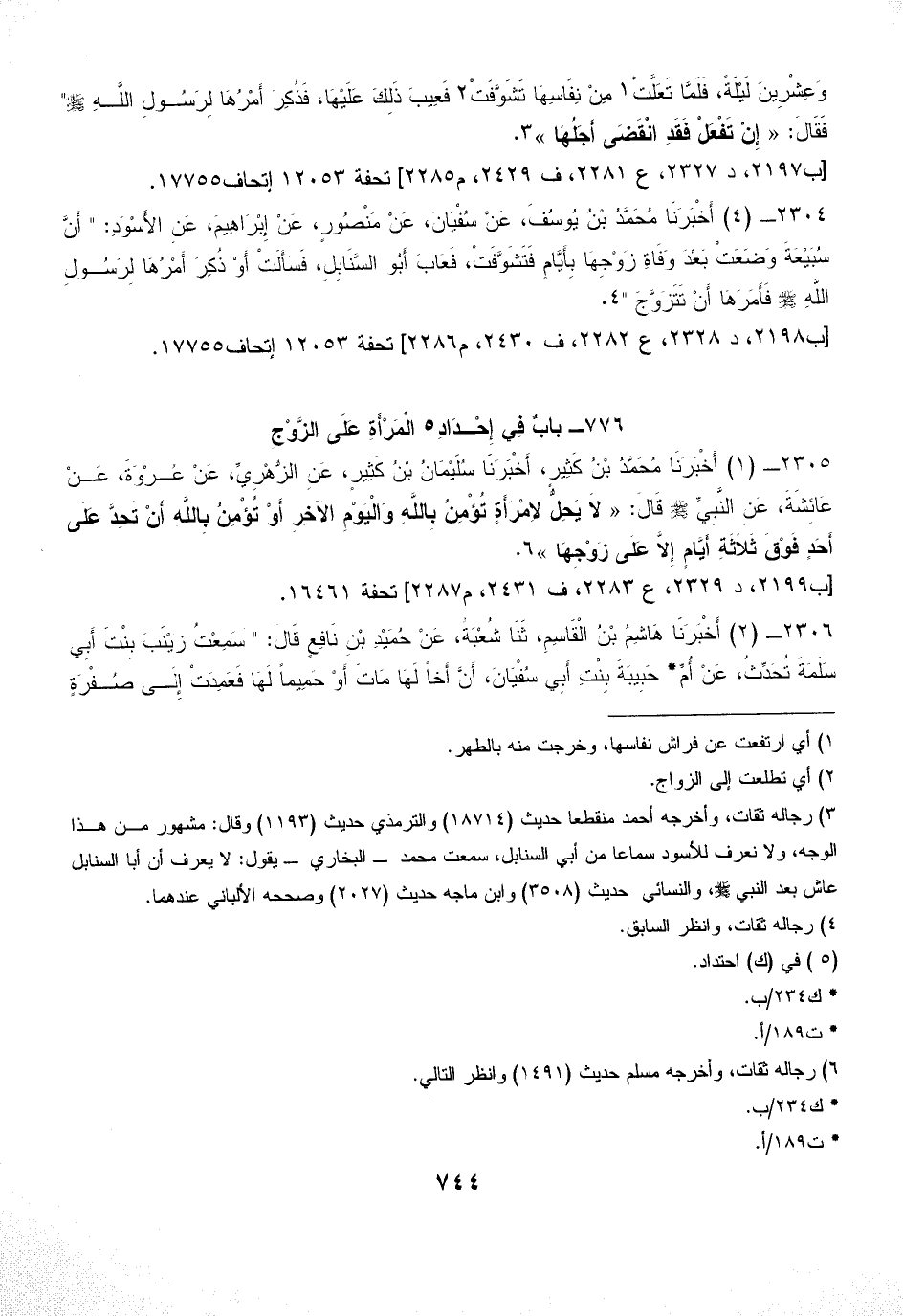 2304 - (4) أَخْبَرَنَا مُحَمَّدُ بْنُ يُوسُفَ، عَنْ سُفْيَانَ، عَنْ مَنْصُورٍ، عَنْ إِبْرَاهِيمَ، عَنِ الأَسْوَدِ: " أَنَّ سُبَيْعَةَ وَضَعَتْ بَعْدَ وَفَاةِ زَوْجِهَا بِأَيَّامٍ فَتَشَوَّفَتْ، فَعَابَ أَبُو السَّنَابِلِ، فَسَأَلَتْ أَوْ ذُكِرَ أَمْرُهَا لِرَسُولِ اللَّهِ - صلى الله عليه وسلم - فَأَمَرَهَا أَنْ تَتَزَوَّجَ " (¬4).