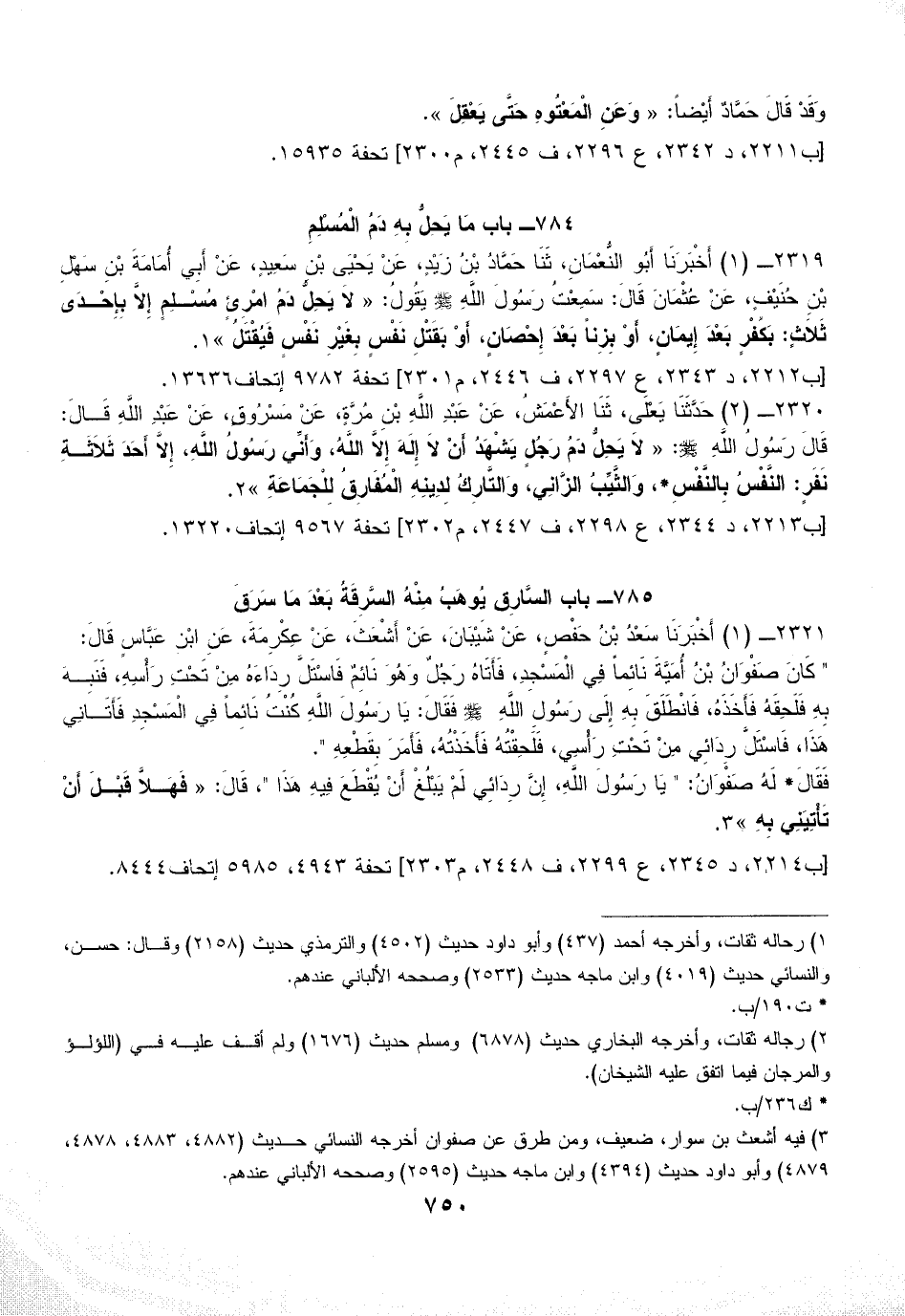 2319 - (1) أَخْبَرَنَا أَبُو النُّعْمَانِ، ثَنَا حَمَّادُ بْنُ زَيْدٍ، عَنْ يَحْيَى بْنِ سَعِيدٍ، عَنْ أَبِي أُمَامَةَ بْنِ سَهْلِ بْنِ حُنَيْفٍ، عَنْ عُثْمَانَ قَالَ: سَمِعْتُ رَسُولَ اللَّهِ - صلى الله عليه وسلم - يَقُولُ: «لاَ يَحِلُّ دَمُ امْرِئٍ مُسْلِمٍ إِلاَّ بِإِحْدَى ثَلاَثٍ: بَكُفْرٍ بَعْدَ إِيمَانٍ، أَوْ بِزِناً بَعْدَ إِحْصَانٍ، أَوْ بَقَتْلِ نَفْسٍ بِغَيْرِ نَفْسٍ فَيُقْتَلُ» (¬1).