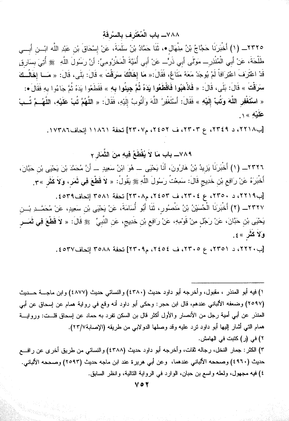 2326 - (1) أَخْبَرَنَا يَزِيدُ بْنُ هَارُونَ، أنَا يَحْيَى - هُوَ ابْنُ سَعِيدٍ - أَنَّ مُحَمَّدَ بْنَ يَحْيَى بْنِ حَبَّانَ، أَخْبَرَهُ عَنْ رَافِعِ بْنِ خَدِيجٍ قَالَ: سَمِعْتُ رَسُولَ اللَّهِ - صلى الله عليه وسلم - يَقُولُ: «لاَ قَطْعَ فِي ثَمَرٍ، وَلاَ كَثَرٍ» (¬3).