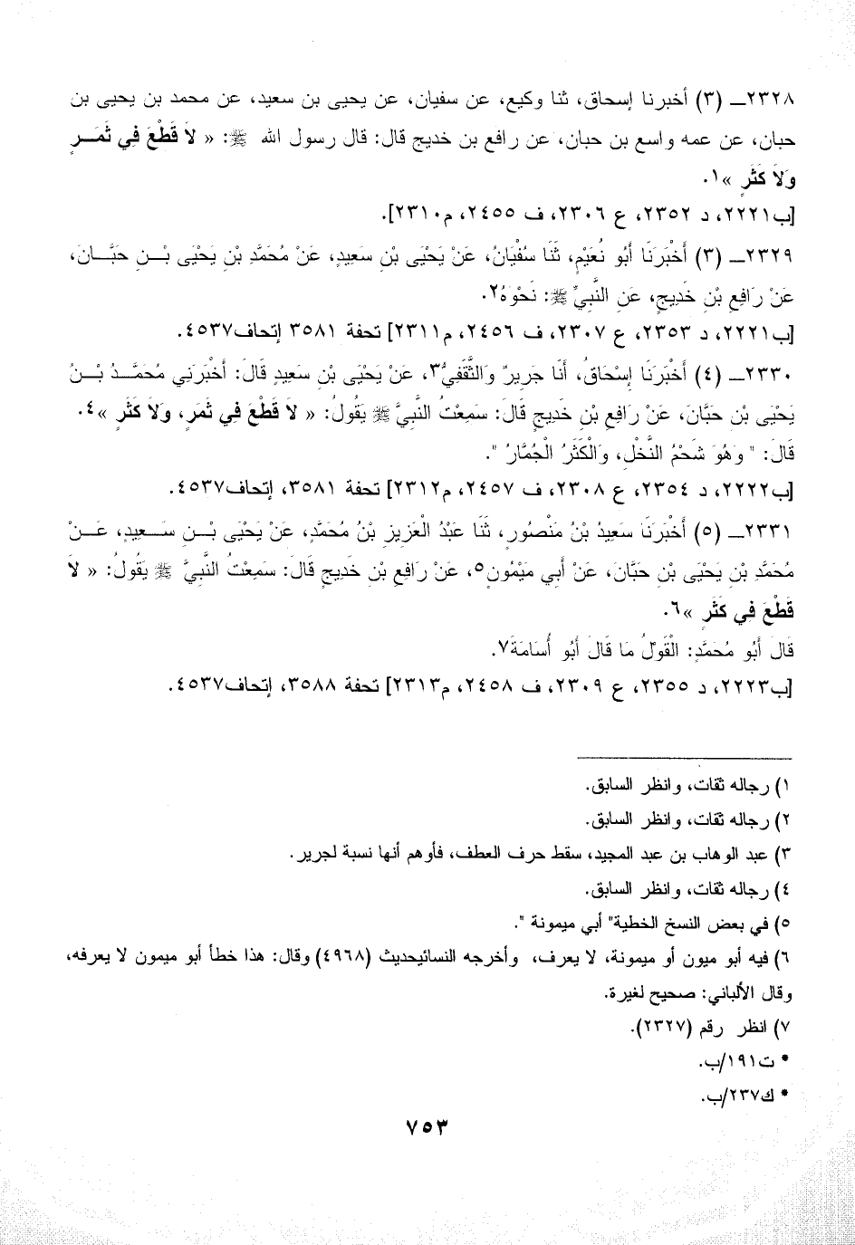 2328 - (3) أخبرنا إسحاق، ثنا وكيع، عن سفيان، عن يحيى بن سعيد، عن محمد بن يحيى بن حبان، عن عمه واسع بن حبان، عن رافع بن خديج قال: قال رسول الله - صلى الله عليه وسلم -: «لاَ قَطْعَ فِي ثَمَرٍ وَلاَ كَثَرٍ» (¬1).