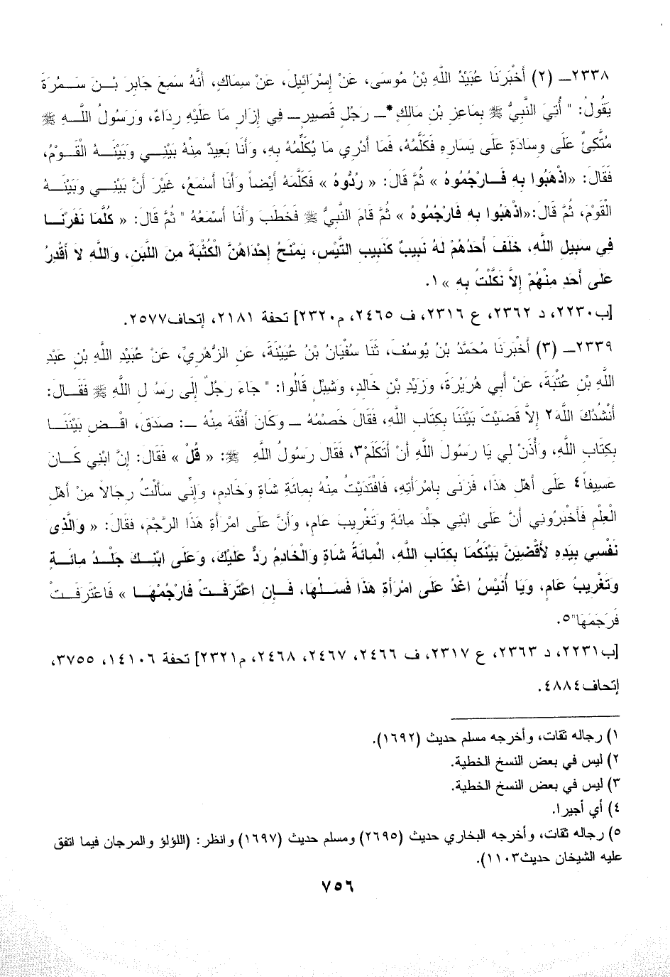 2338 - (2) أَخْبَرَنَا عُبَيْدُ اللَّهِ بْنُ مُوسَى، عَنْ إِسْرَائِيلَ، عَنْ سِمَاكٍ، أَنَّهُ سَمِعَ جَابِرَ بْنَ سَمُرَةَ يَقُولُ: " أُتِيَ النَّبِيُّ - صلى الله عليه وسلم - بِمَاعِزِ بْنِ مَالِكٍ*- رَجُلٍ قَصِيرٍ - فِي إِزَارٍ مَا عَلَيْهِ رِدَاءٌ، وَرَسُولُ اللَّهِ - صلى الله عليه وسلم - مُتَّكِئٌ عَلَى وِسَادَةٍ عَلَى يَسَارِهِ فَكَلَّمُهُ، فَمَا أَدْرِي مَا يُكَلِّمُهُ بِهِ، وَأَنَا بَعِيدٌ مِنْهُ بَيْنِي وَبَيْنَهُ الْقَوْمُ، فَقَالَ: «اذْهَبُوا بِهِ فَارْجُمُوهُ» ثُمَّ قَالَ: «رُدُّوهُ» فَكَلَّمَهُ أَيْضاً وَأَنَا أَسْمَعُ، غَيْرَ أَنَّ بَيْنِي وَبَيْنَهُ الْقَوْمَ، ثُمَّ قَالَ: «اذْهَبُوا بِهِ فَارْجُمُوهُ» ثُمَّ قَامَ النَّبِيُّ - صلى الله عليه وسلم - فَخَطَبَ وَأَنَا أَسْمَعُهُ " ثُمَّ قَالَ: «كُلَّمَا نَفَرْنَا فِي سَبِيلِ اللَّهِ، خَلَفَ أَحَدُهُمْ لَهُ نَبِيبٌ كَنَبِيبِ التَّيْسِ، يَمْنَحُ إِحْدَاهُنَّ الْكُثْبَةَ مِنَ اللَّبَنِ، وَاللَّهِ لاَ أَقْدِرُ عَلَى أَحَدٍ مِنْهُمْ إِلاَّ نَكَّلْتُ بِهِ» (¬1).