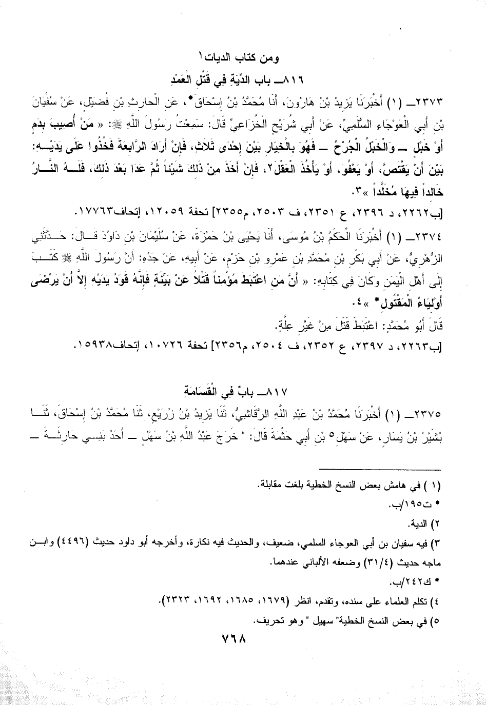 2373 - (1) أَخْبَرَنَا يَزِيدُ بْنُ هَارُونَ، أَنَا مُحَمَّدُ بْنُ إِسْحَاقَ*، عَنِ الْحَارِثِ بْنِ فُضَيْلٍ، عَنْ سُفْيَانَ بْنِ أَبِي الْعَوْجَاءِ السُّلَمِيِّ، عَنْ أَبِي شُرَيْحٍ الْخُزَاعِيِّ قَالَ: سَمِعْتُ رَسُولَ اللَّهِ - صلى الله عليه وسلم -: «مَنْ أُصِيبَ بِدَمٍ أَوْ خَبْلٍ - وَالْخَبْلُ الْجُرْحُ - فَهُوَ بِالْخِيَارِ بَيْنَ إِحْدَى ثَلاَثٍ، فَإِنْ أَرَادَ الرَّابِعَةَ فَخُذُوا عَلَى يَدَيْهِ: بَيْنَ أَنْ يَقْتَصَّ، أَوْ يَعْفُوَ، أَوْ يَأْخُذَ الْعَقْلَ (¬2)، فَإِنْ أَخَذَ مِنْ ذَلِكَ شَيْئاً ثُمَّ عَدَا بَعْدَ ذَلِكَ، فَلَهُ النَّارُ خَالِداً فِيهَا مُخَلَّداً» (¬3).