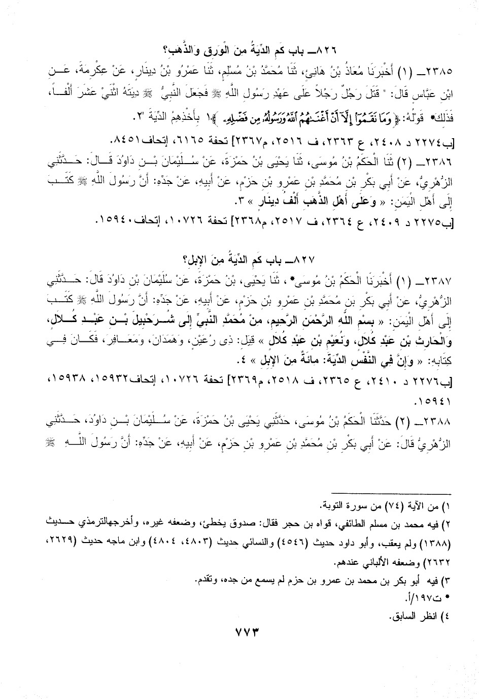 2386 - (2) ثَنَا الْحَكَمُ بْنُ مُوسَى، ثَنَا يَحْيَى بْنُ حَمْزَةَ، عَنْ سُلَيْمَانَ بْنِ دَاوُدَ قَالَ: حَدَّثَنِي الزُّهْرِيُّ، عَنْ أَبِي بَكْرِ بْنِ مُحَمَّدِ بْنِ عَمْرِو بْنِ حَزْمٍ، عَنْ أَبِيهِ، عَنْ جَدِّهِ: أَنَّ رَسُولَ اللَّهِ - صلى الله عليه وسلم - كَتَبَ إِلَى أَهْلِ الْيَمَنِ: «وَعَلَى أَهْلِ الذَّهَبِ أَلْفُ دِينَارٍ» (¬3).