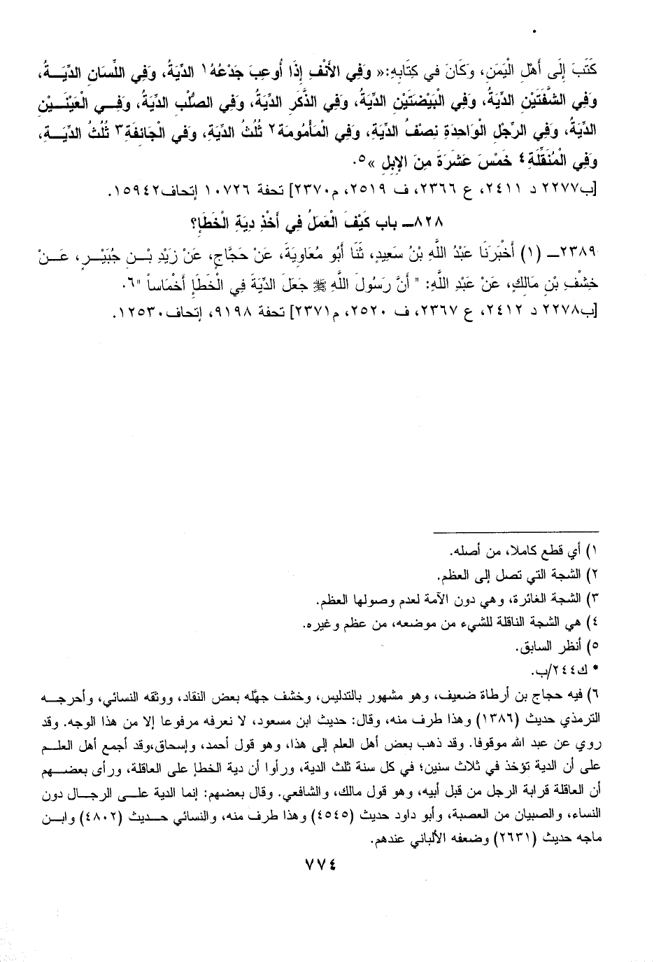 (¬6) فيه حجاج بن أرطاة ضعيف، وهو مشهور بالتدليس، وخشف جهَّله بعض النقاد، ووثقه النسائي، وأحرجه الترمذي حديث (1386) وهذا طرف منه، وقال: حديث ابن مسعود، لا نعرفه مرفوعا إلا من هذا الوجه. وقد روي عن عبد الله موقوفا. وقد ذهب بعض أهل العلم إلى هذا، وهو قول أحمد، وإسحاق، وقد أجمع أهل العلم على أن الدية تؤخذ في ثلاث سنين؛ في كل سنة ثلث الدية، ورأوا أن دية الخطإ على العاقلة، ورأى بعضهم أن العاقلة قرابة الرجل من قبل أبيه، وهو قول مالك، والشافعي. وقال بعضهم: إنما الدية على الرجال دون النساء، والصبيان من العصبة، وأبو داود حديث (4545) وهذا طرف منه، والنسائي حديث (4802) وابن ماجه حديث (2631) وضعفه الألباني عندهم.
