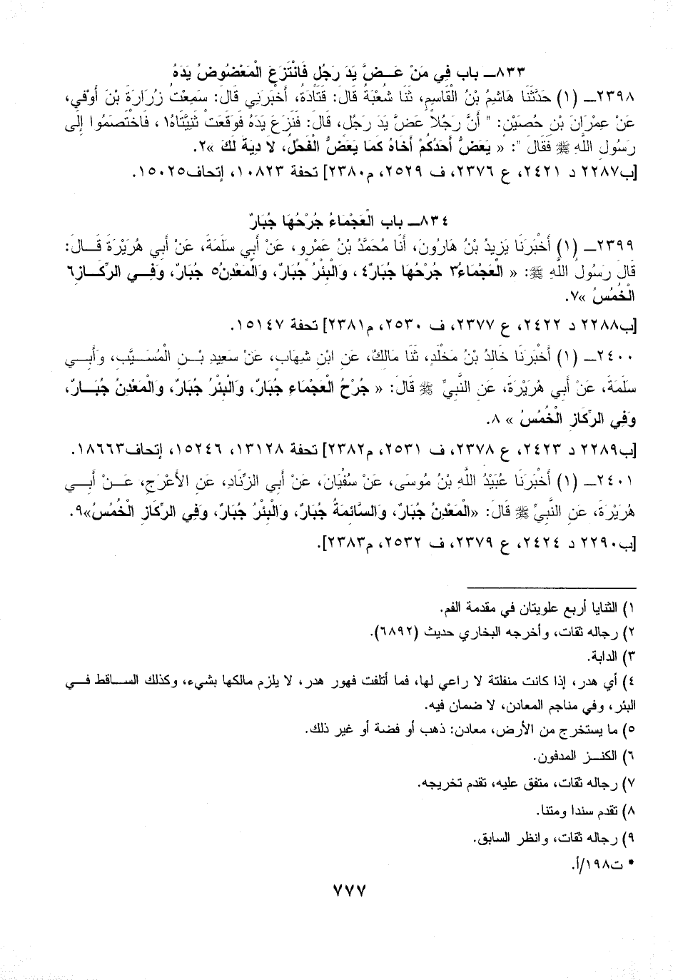 2401 - (1) أَخْبَرَنَا عُبَيْدُ اللَّهِ بْنُ مُوسَى، عَنْ سُفْيَانَ، عَنْ أَبِي الزِّنَادِ، عَنِ الأَعْرَجِ، عَنْ أَبِي هُرَيْرَةَ، عَنِ النَّبِيِّ - صلى الله عليه وسلم - قَالَ: «الْمَعْدِنُ جُبَارٌ، وَالسَّائِمَةُ جُبَارٌ، وَالْبِئْرُ جُبَارٌ، وَفِي الرِّكَازِ الْخُمُسُ» (¬9).