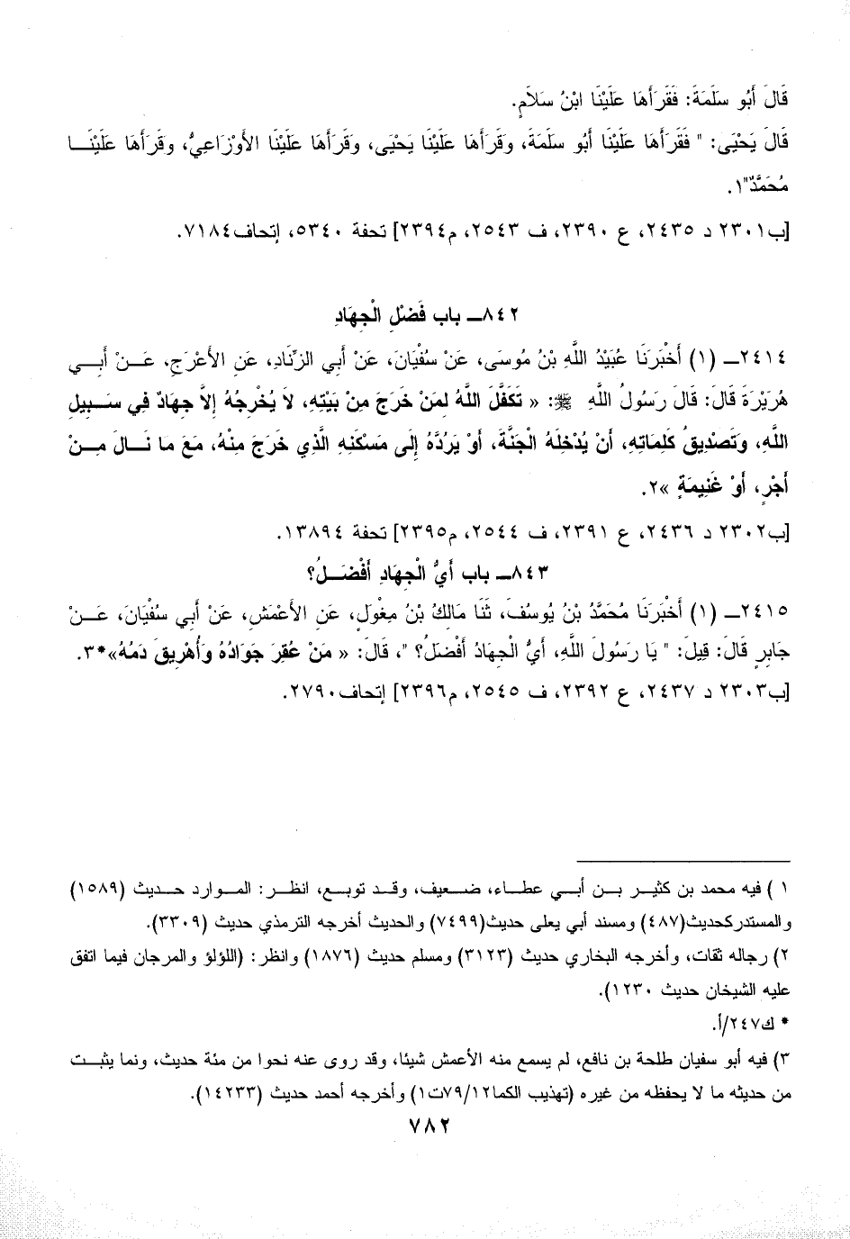 2415 - (1) أَخْبَرَنَا مُحَمَّدُ بْنُ يُوسُفَ، ثَنَا مَالِكُ بْنُ مِغْوَلٍ، عَنِ الأَعْمَشِ، عَنْ أَبِي سُفْيَانَ، عَنْ جَابِرٍ قَالَ: قِيلَ: " يَا رَسُولَ اللَّهِ، أَيُّ الْجِهَادُ أَفْضَلُ؟ "، قَالَ: «مَنْ عُقِرَ جَوَادُهُ وَأُهْرِيقَ دَمُهُ» * (¬3).