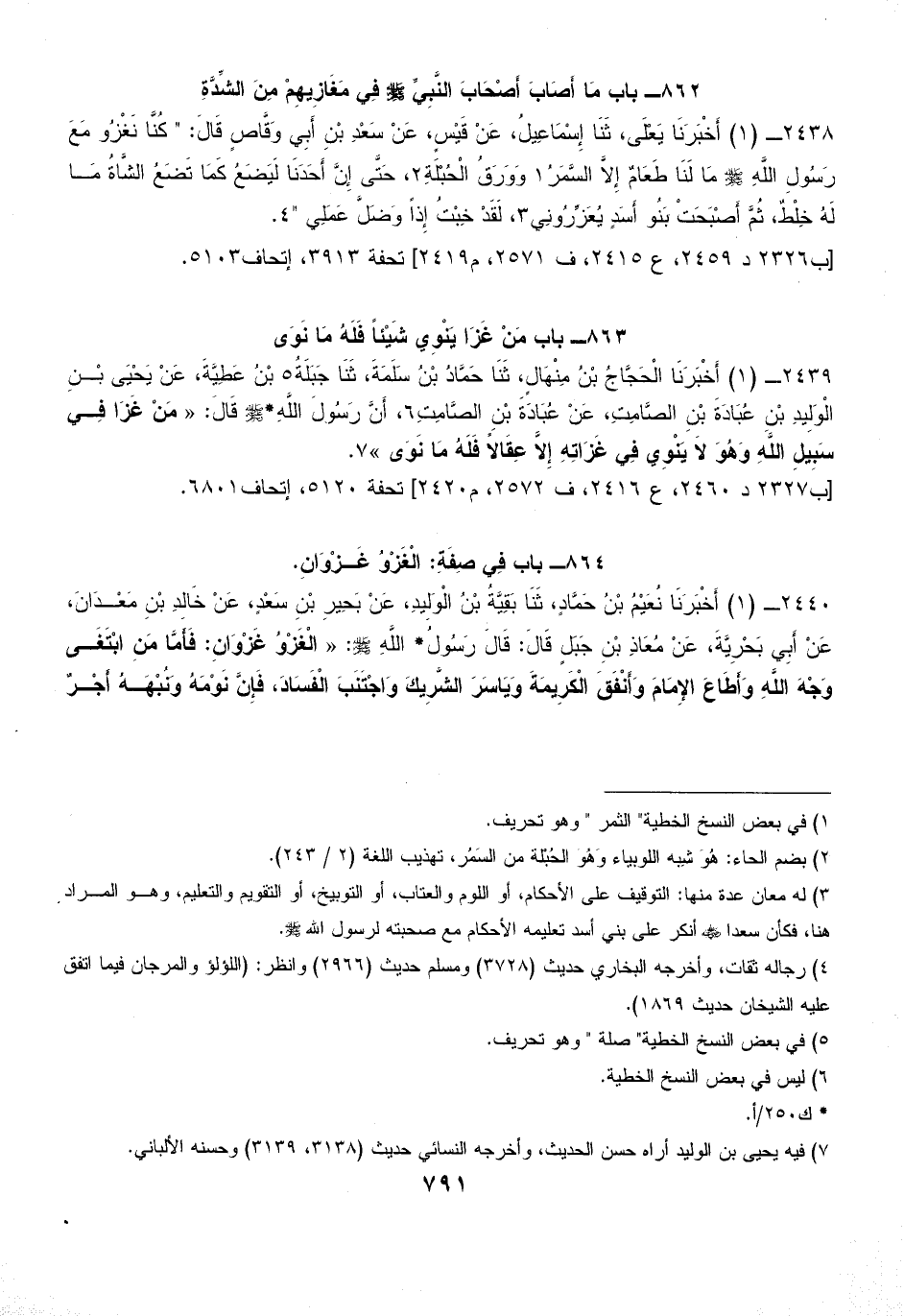 2440 - (1) أَخْبَرَنَا نُعَيْمُ بْنُ حَمَّادٍ، ثَنَا بَقِيَّةُ بْنُ الْوَلِيدِ، عَنْ بَحِيرِ بْنِ سَعْدٍ، عَنْ خَالِدِ بْنِ مَعْدَانَ، عَنْ أَبِي بَحْرِيَّةَ، عَنْ مُعَاذِ بْنِ جَبَلٍ قَالَ: قَالَ رَسُولُ* اللَّهِ - صلى الله عليه وسلم -: «الْغَزْوُ غَزْوَانِ: فَأَمَّا مَنِ ابْتَغَى وَجْهَ اللَّهِ وَأَطَاعَ الإِمَامَ وَأَنْفَقَ الْكَرِيمَةَ وَيَاسَرَ الشَّرِيكَ وَاجْتَنَبَ الْفَسَادَ، فَإِنَّ نَوْمَهُ وَنُبْهَهُ أَجْرٌ