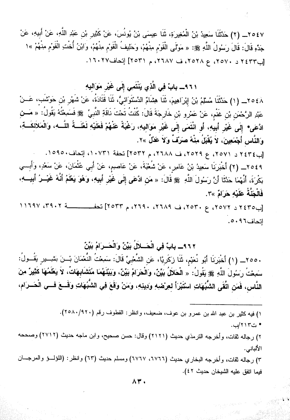 2550 - (1) أَخْبَرَنَا أَبُو نُعَيْمٍ، ثَنَا زَكَرِيَّا، عَنِ الشَّعْبِيِّ قَالَ: سَمِعْتُ النُّعْمَانَ بْنَ بَشِيرٍ يَقُولُ: سَمِعْتُ رَسُولَ اللَّهِ - صلى الله عليه وسلم - يَقُولُ: «الْحَلاَلُ بَيِّنٌ، وَالْحَرَامُ بَيِّنٌ، وَبَيْنَهُمَا مُتَشَابِهَاتٌ، لاَ يَعْلَمُهَا كَثِيرٌ مِنَ النَّاسِ، فَمَنِ اتَّقَى الشُّبُهَاتِ اسْتَبْرَأَ لِعِرْضِهِ وَدِينِهِ، وَمَنْ وَقَعَ فِي الشُّبُهَاتِ وَقَعَ في الْحَرَامِ،