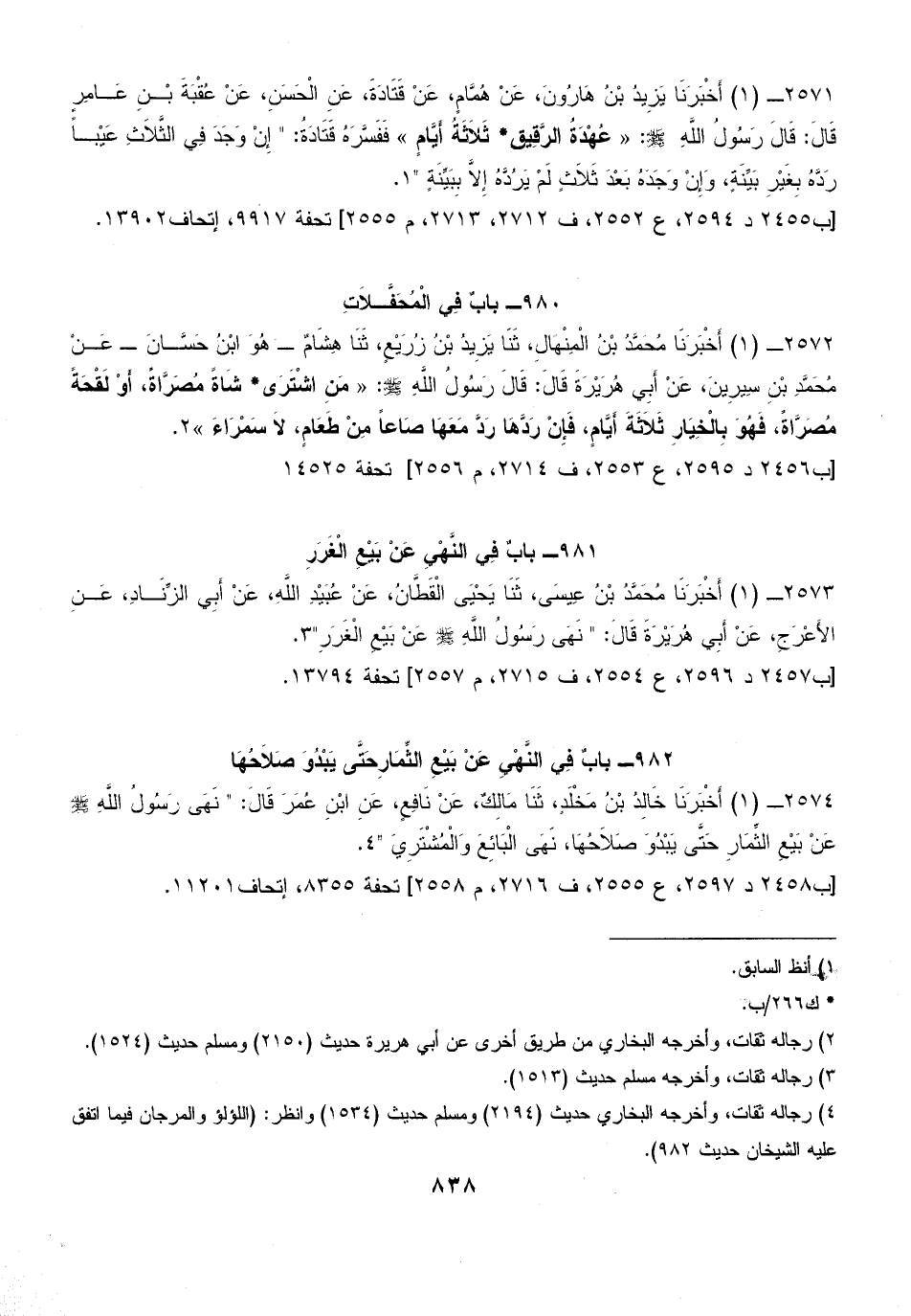 2573 - (1) أَخْبَرَنَا مُحَمَّدُ بْنُ عِيسَى، ثَنَا يَحْيَى الْقَطَّانُ، عَنْ عُبَيْدِ اللَّهِ، عَنْ أَبِي الزِّنَادِ، عَنِ الأَعْرَجِ، عَنْ أَبِي هُرَيْرَةَ قَالَ: " نَهَى رَسُولُ اللَّهِ - صلى الله عليه وسلم - عَنْ بَيْعِ الْغَرَرِ" (¬3).