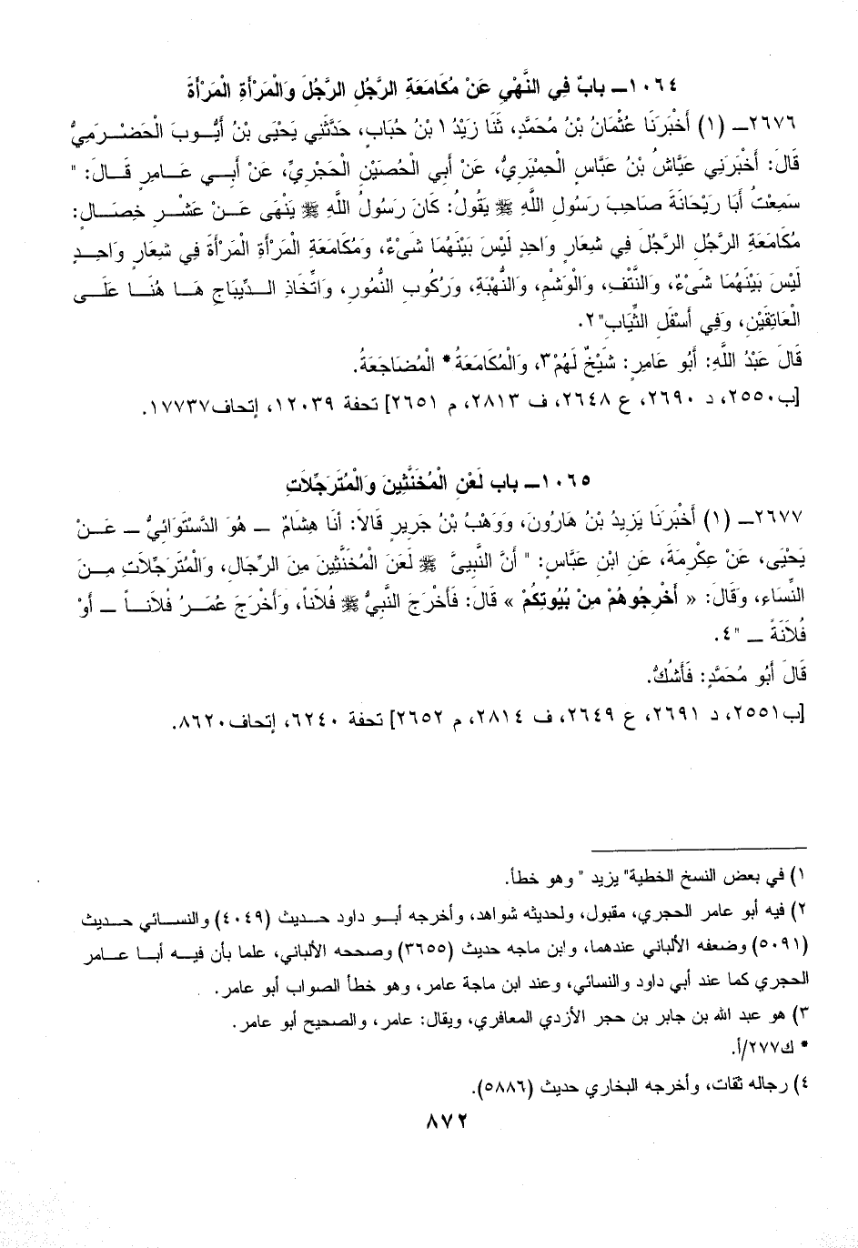 2677 - (1) أَخْبَرَنَا يَزِيدُ بْنُ هَارُونَ، وَوَهْبُ بْنُ جَرِيرٍ قَالاَ: أنَا هِشَامٌ - هُوَ الدَّسْتَوَائِيُّ - عَنْ يَحْيَى، عَنْ عِكْرِمَةَ، عَنِ ابْنِ عَبَّاسٍ: " أَنَّ النَّبِيىَّ - صلى الله عليه وسلم - لَعَنَ الْمُخَنَّثِينَ مِنَ الرِّجَالِ، وَالْمُتَرَجِّلاَتِ مِنَ النِّسَاءِ، وَقَالَ: «أَخْرِجُوهُمْ مِنْ بُيُوتِكُمْ» قَالَ: فَأَخْرَجَ النَّبِيُّ - صلى الله عليه وسلم - فُلاَناً، وَأَخْرَجَ عُمَرُ فُلاَناً - أَوْ فُلاَنَةً - " (¬4).