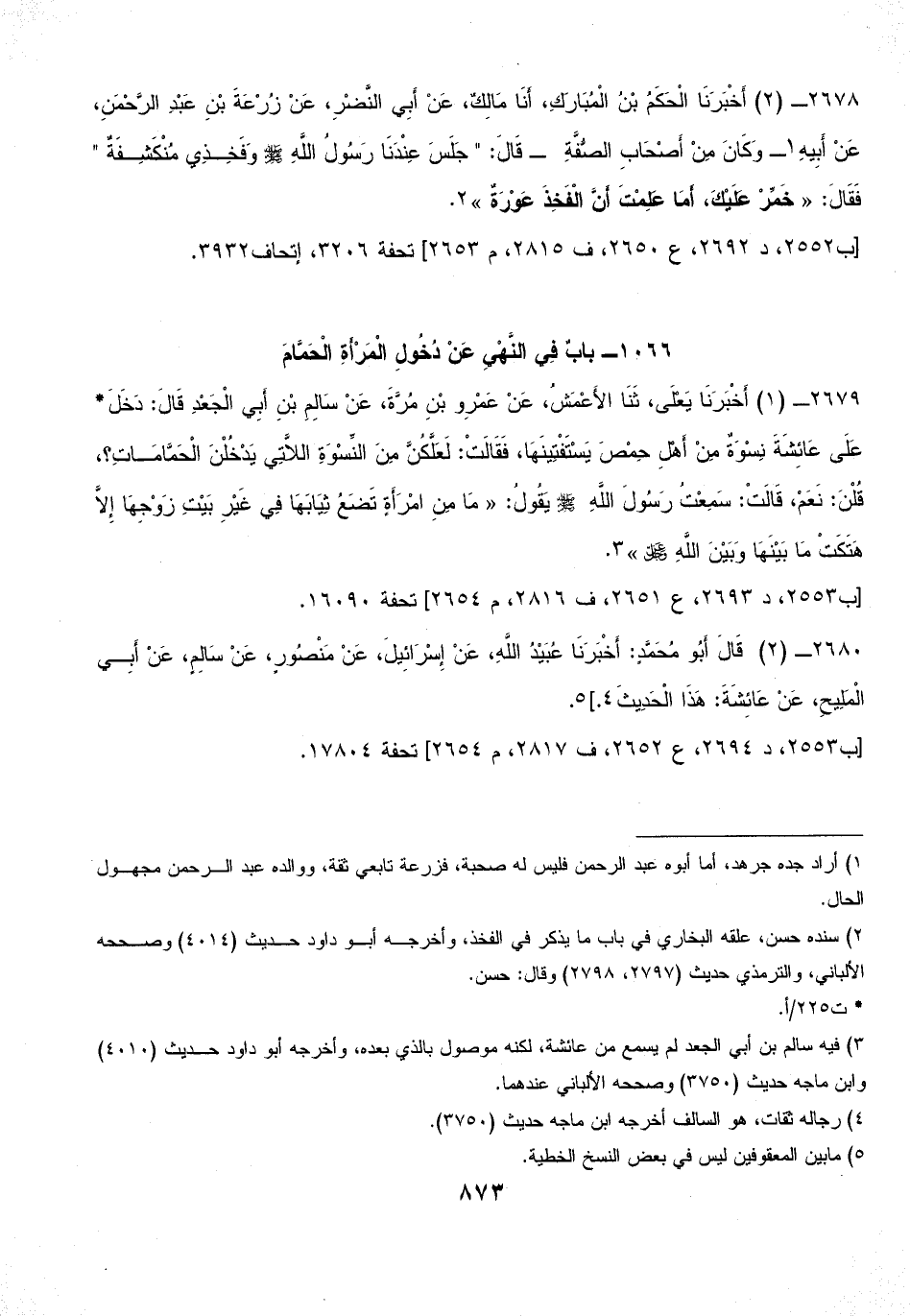 2679 - (1) أَخْبَرَنَا يَعْلَى، ثَنَا الأَعْمَشُ، عَنْ عَمْرِو بْنِ مُرَّةَ، عَنْ سَالِمِ بْنِ أَبِي الْجَعْدِ قَالَ: دَخَلَ* عَلَى عَائِشَةَ نِسْوَةٌ مِنْ أَهْلِ حِمْصَ يَسْتَفْتِينَهَا، فَقَالَتْ: لَعَلَّكُنَّ مِنَ النِّسْوَةِ اللاَّتِي يَدْخُلْنَ الْحَمَّامَاتِ؟ ، قُلْنَ: نَعَمْ، قَالَتْ: سَمِعْتُ رَسُولَ اللَّهِ - صلى الله عليه وسلم - يَقُولُ: «مَا مِنِ امْرَأَةٍ تَضَعُ ثِيَابَهَا فِي غَيْرِ بَيْتِ زَوْجِهَا إِلاَّ هَتَكَتْ مَا بَيْنَهَا وَبَيْنَ اللَّهِ - عز وجل -» (¬3).
