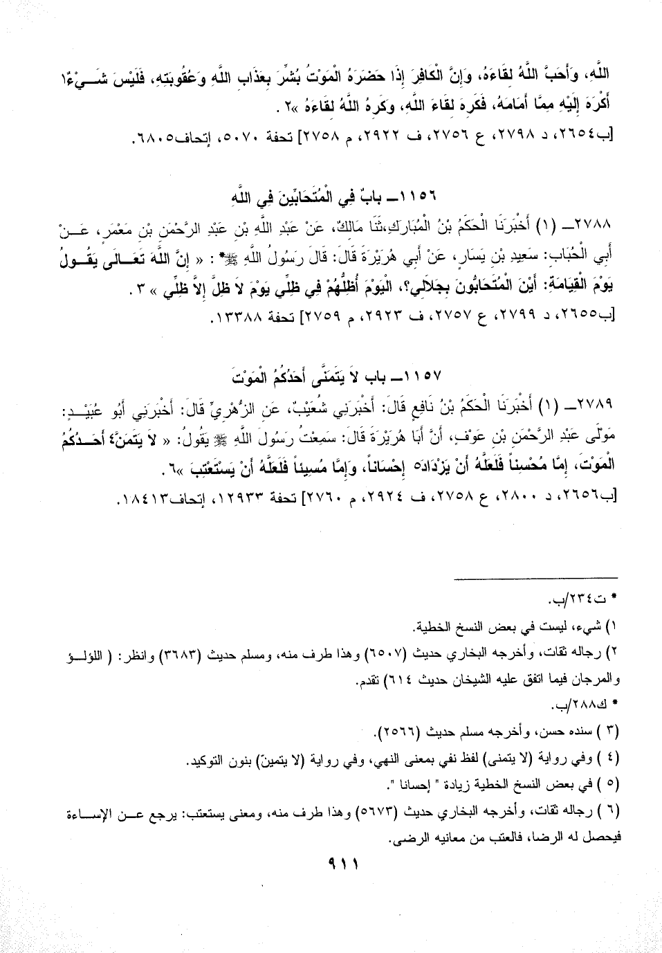 2789 - (1) أَخْبَرَنَا الْحَكَمُ بْنُ نَافِعٍ قَالَ: أَخْبَرَنِي شُعَيْبٌ، عَنِ الزُّهْرِيِّ قَالَ: أَخْبَرَنِي أَبُو عُبَيْدٍ: مَوْلَى عَبْدِ الرَّحْمَنِ بْنِ عَوْفٍ، أَنَّ أَبَا هُرَيْرَةَ قَالَ: سَمِعْتُ رَسُولَ اللَّهِ - صلى الله عليه وسلم - يَقُولُ «لاَ يَتَمَنَّ (¬4) أَحَدُكُمُ الْمَوْتَ، إِمَّا مُحْسِناً فَلَعَلَّهُ أَنْ يَزْدَادَ (¬5) إِحْسَاناً، وَإِمَّا مُسِيئاً فَلَعَلَّهُ أَنْ يَسْتَعْتِبَ» (¬6).