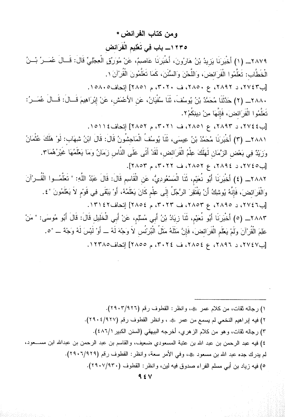 2879 - (1) أَخْبَرَنَا يَزِيدُ بْنُ هَارُونَ، أَخْبَرَنَا عَاصِمٌ، عَنْ مُوَرِّقٍ الْعِجْلِيِّ قَالَ: قَالَ عُمَرُ بْنُ الْخَطَّابِ: تَعَلَّمُوا الْفَرَائِضَ، وَاللَّحْنَ وَالسُّنَنَ، كَمَا تَعَلَّمُونَ الْقُرْآنَ (¬1).