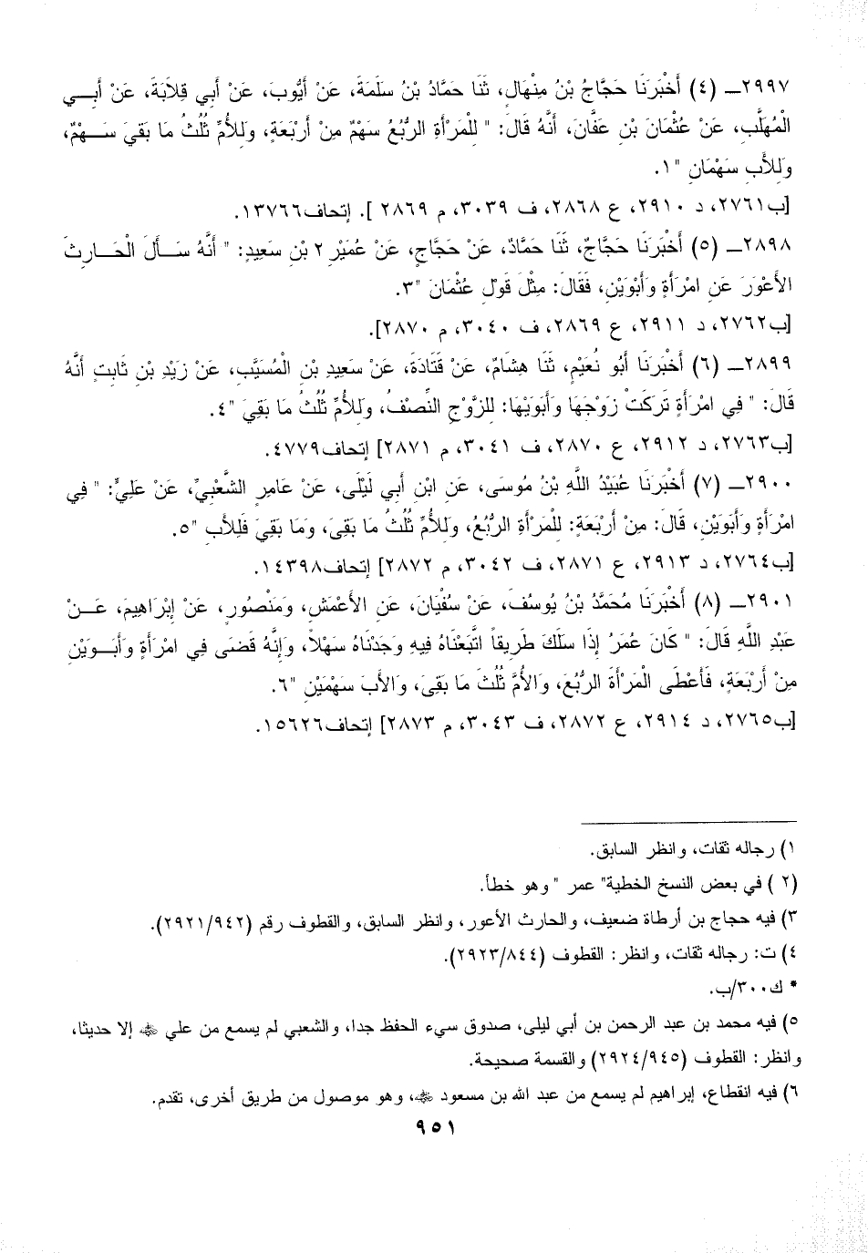2997 - (4) أَخْبَرَنَا حَجَّاجُ بْنُ مِنْهَالٍ، ثَنَا حَمَّادُ بْنُ سَلَمَةَ، عَنْ أَيُّوبَ، عَنْ أَبِي قِلاَبَةَ، عَنْ أَبِي الْمُهَلَّبِ، عَنْ عُثْمَانَ بْنِ عَفَّانَ، أَنَّهُ قَالَ: " لِلْمَرْأَةِ الرُّبُعُ سَهْمٌ مِنْ أَرْبَعَةٍ، وَلِلأُمِّ ثُلُثُ مَا بَقيَ سَهْمٌ، وَلِلأَبِ سَهْمَانِ " (¬1).
