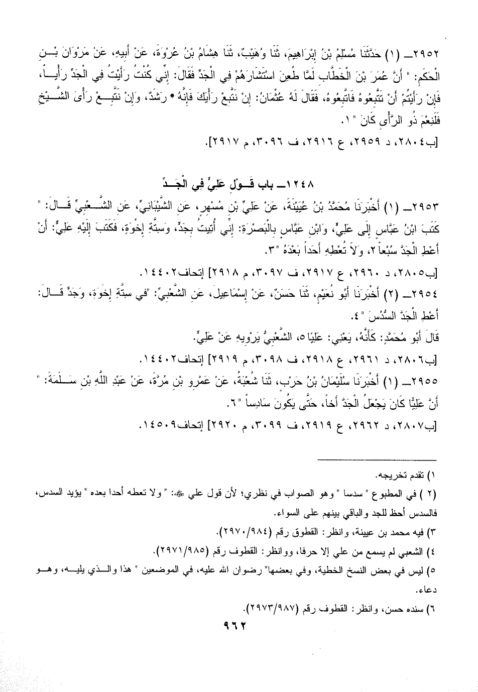 2953 - (1) أَخْبَرَنَا مُحَمَّدُ بْنُ عُيَيْنَةَ، عَنْ عَلِيِّ بْنِ مُسْهِرٍ، عَنِ الشَّيْبَانِيِّ، عَنِ الشَّعْبِيِّ قَالَ: " كَتَبَ ابْنُ عَبَّاسٍ إِلَى عَلِيٍّ، وَابْنِ عَبَّاسٍ بِالْبَصْرَةِ: إِنِّي أُتِيتُ بِجَدٍّ، وَسِتَّةِ إِخْوَةٍ، فَكَتَبَ إِلَيْهِ عَلِيٌّ: أَنْ أَعْطِ الْجَدَّ سُبْعاً (¬2)، وَلاَ تُعْطِهِ أَحَداً بَعْدَهُ " (¬3).