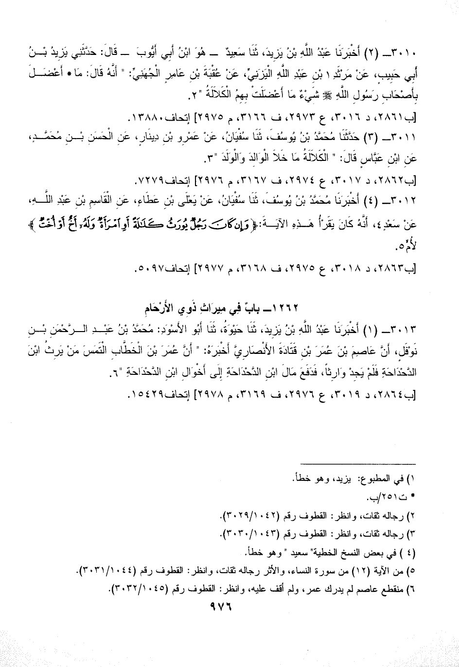 3010 - (2) أَخْبَرَنَا عَبْدُ اللَّهِ بْنُ يَزِيدَ، ثَنَا سَعِيدٌ - هُوَ ابْنُ أَبِي أَيُّوبَ - قَالَ: حَدَّثَنِي يَزِيدُ بْنُ أَبِي حَبِيبٍ، عَنْ مَرْثَدِ (¬1) بْنِ عَبْدِ اللَّهِ الْيَزَنِيِّ، عَنْ عُقْبَةَ بْنِ عَامِرٍ الْجُهَنِيِّ: " أَنَّهُ قَالَ: مَا* أَعْضَلَ بِأَصْحَابِ رَسُولِ اللَّهِ - صلى الله عليه وسلم - شَيْءٌ مَا أَعْضَلَتْ بِهِمُ الْكَلاَلَةُ " (¬2).