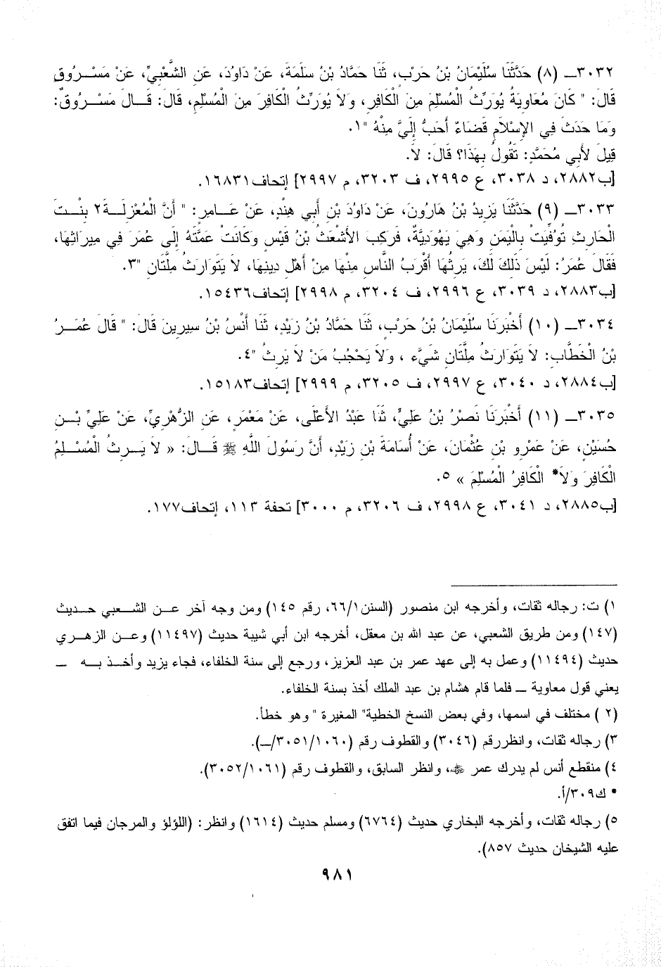 3032 - (8) حَدَّثَنَا سُلَيْمَانُ بْنُ حَرْبٍ، ثَنَا حَمَّادُ بْنُ سَلَمَةَ، عَنْ دَاوُدَ، عَنِ الشَّعْبِيِّ، عَنْ مَسْرُوقٍ قَالَ: " كَانَ مُعَاوِيَةُ يُوَرِّثُ الْمُسْلِمَ مِنَ الْكَافِرِ، وَلاَ يُوَرِّثُ الْكَافِرَ مِنَ الْمُسْلِمِ، قَالَ: قَالَ مَسْرُوقٌ: وَمَا حَدَثَ فِي الإِسْلاَمِ قَضَاءٌ أَحَبُّ إِلَيَّ مِنْهُ " (¬1).