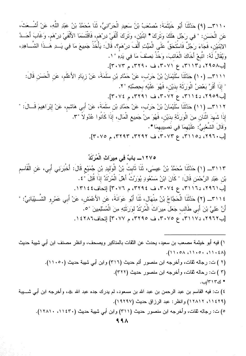3113 - (1) حَدَّثَنَا مُحَمَّدُ بْنُ عِيسَى، ثَنَا ثَابِتُ بْنُ الْوَلِيدِ بْنِ جُمَيْعٍ قَالَ: أَخْبَرَنِي أَبِي، عَنِ الْقَاسِمِ بْنِ عَبْدِ الرَّحْمَنِ قَالَ: " كَانَ ابْنُ مَسْعُودٍ يُوَرِّثُ أَهْلَ الْمُرْتَدِّ إِذَا قُتِلَ " (¬4).