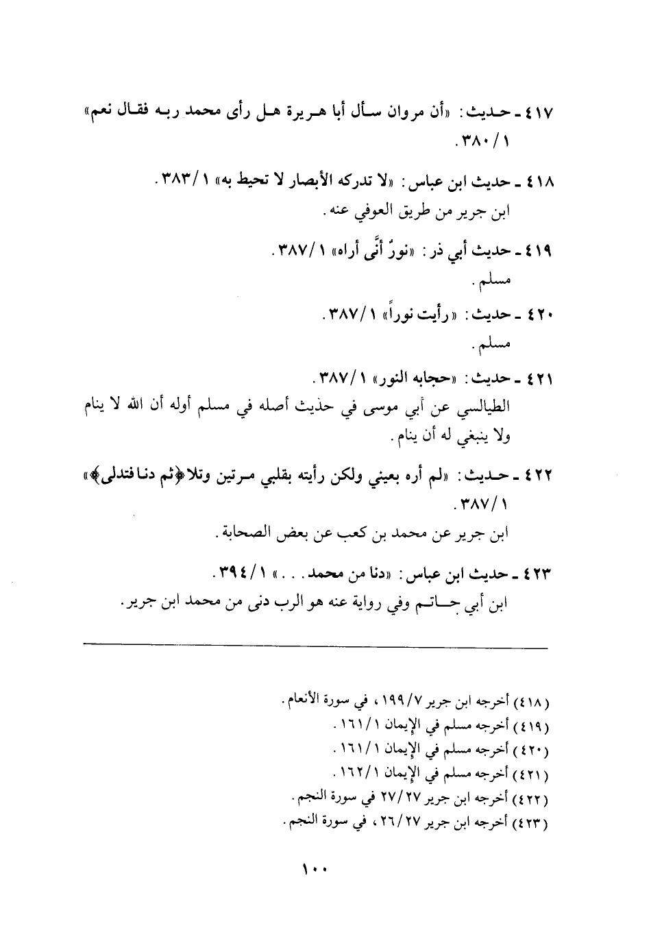 418 - حديث ابن عباس: "لا تدركه الأبصار لا تحيط به" 1/ 383.