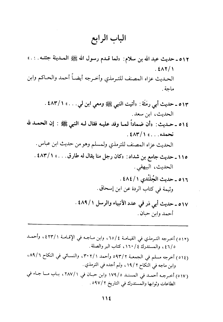 514 - حديث: "أن ضمادًا لما وفد عليه فقال له النبي - صلى الله عليه وسلم -: إن الحمد لله نحمده ... " 1/ 483.