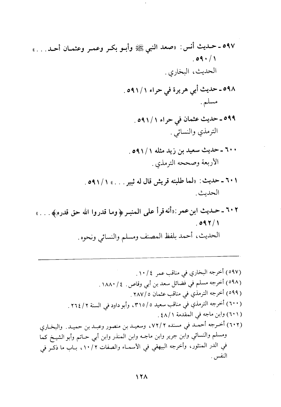 597 - حديث أنس: "صعد النبي - صلى الله عليه وسلم - وأبو بكر وعمر وعثمان أحد ... " 1/ 590.