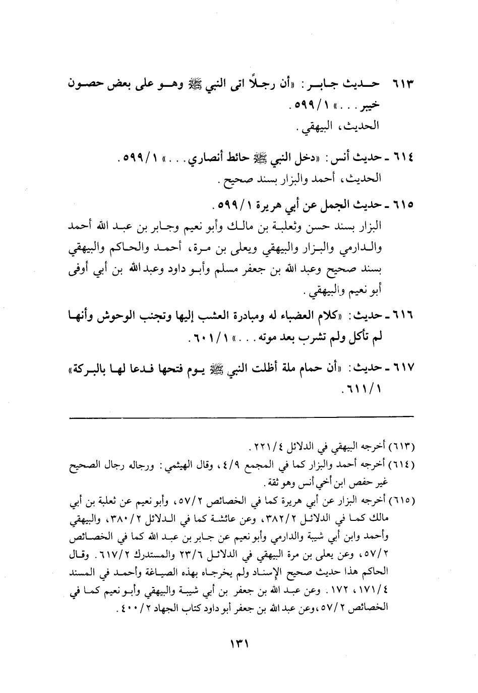 616 - حديث: "كلام العضباء له ومبادرة العشب إليها وتجنب الوحوش وأنها لم تأكل ولم تشرب بعد موته ... " 1/ 601.