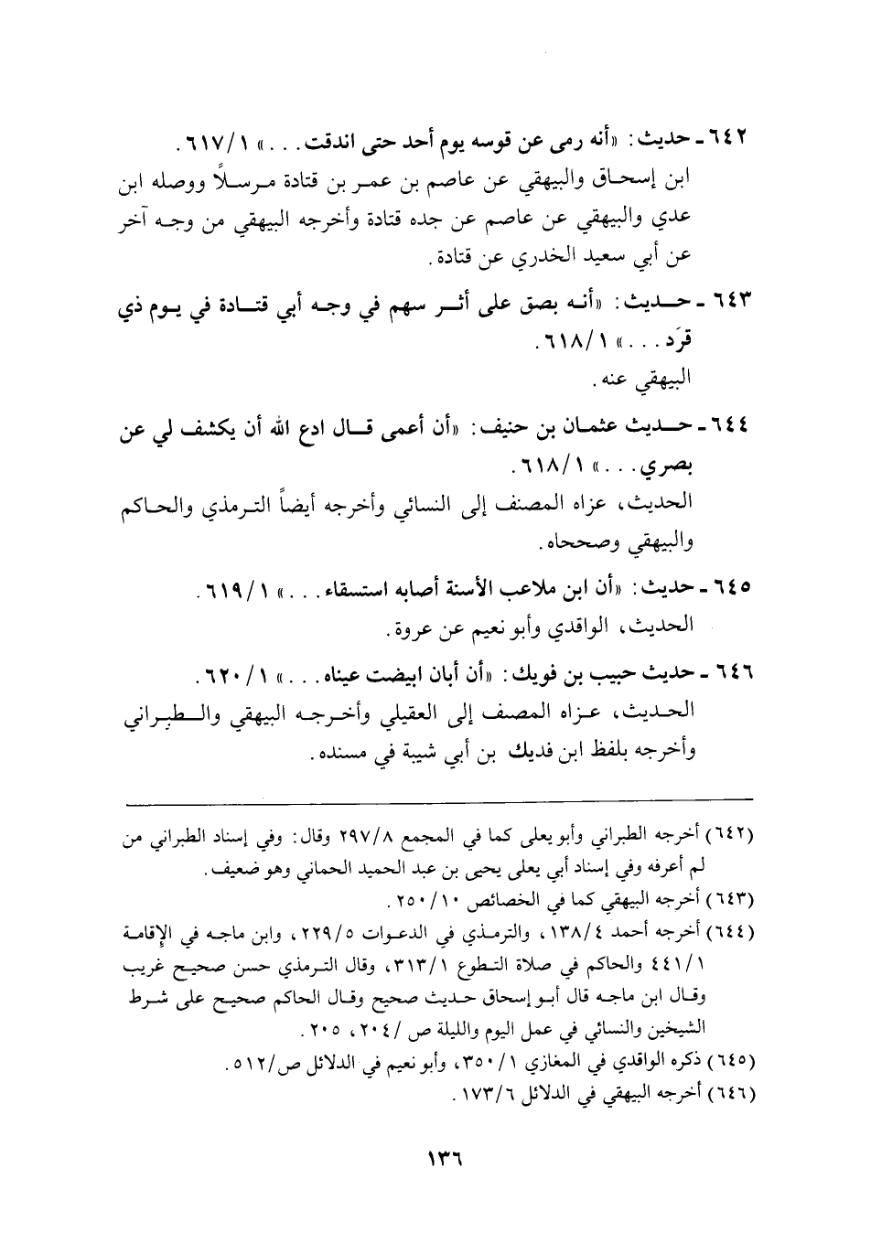 643 - حديث: "أنه بصق على أثر سهم في وجه أبي قتادة في يوم ذي قرَد ... " 1/ 618.