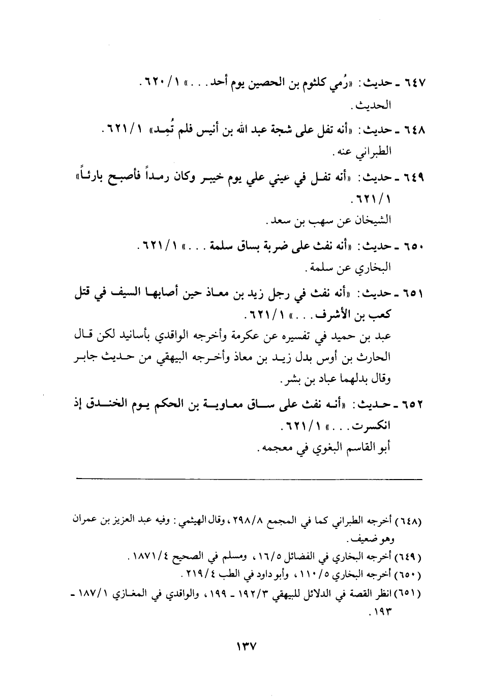 650 - حديث: "أنه نفث على ضربة بساق سلمة ... " 1/ 621.