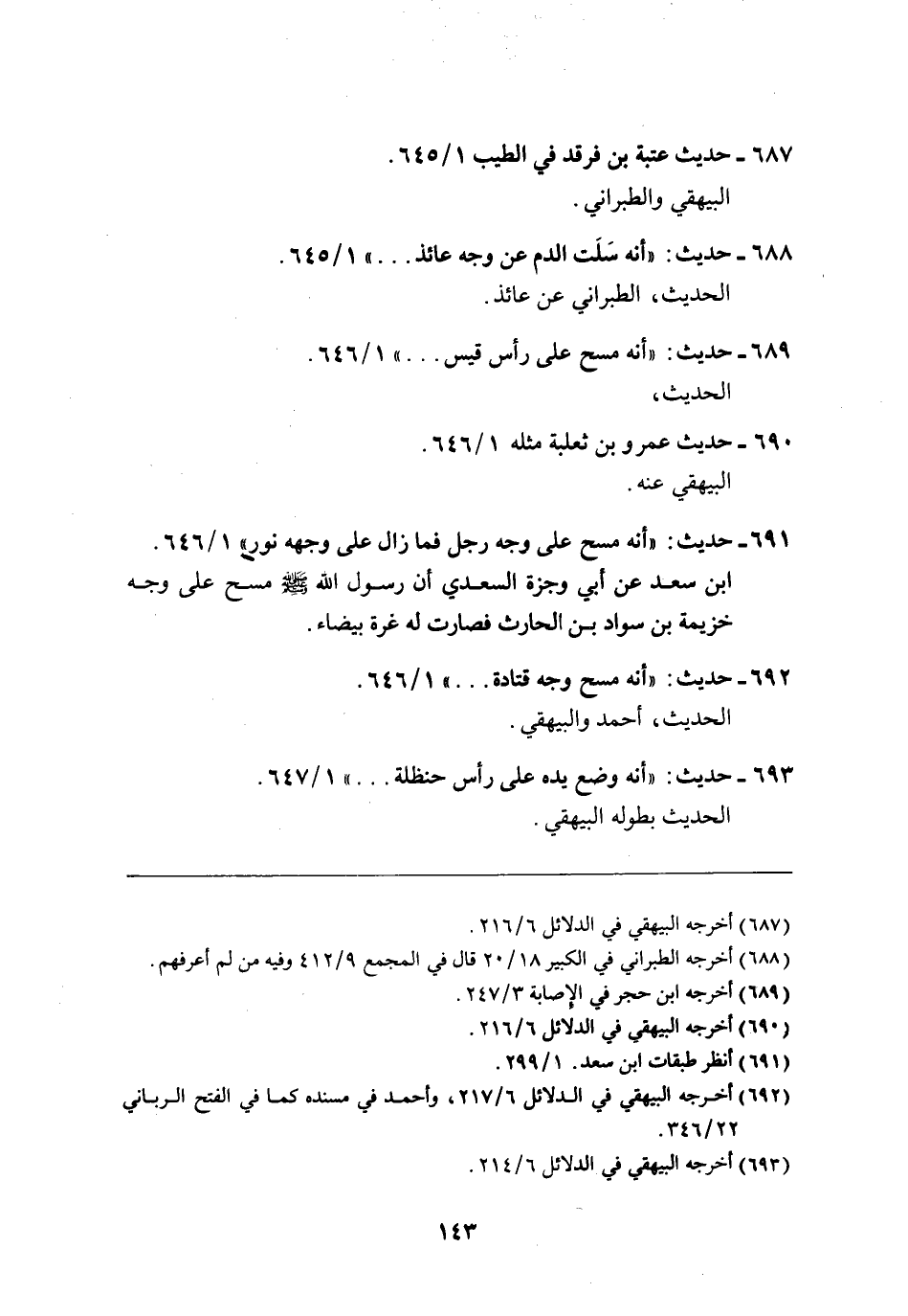 691 - حديث: "أنه مسح على وجه رجل فما زال على وجهه نور" 1/ 646.