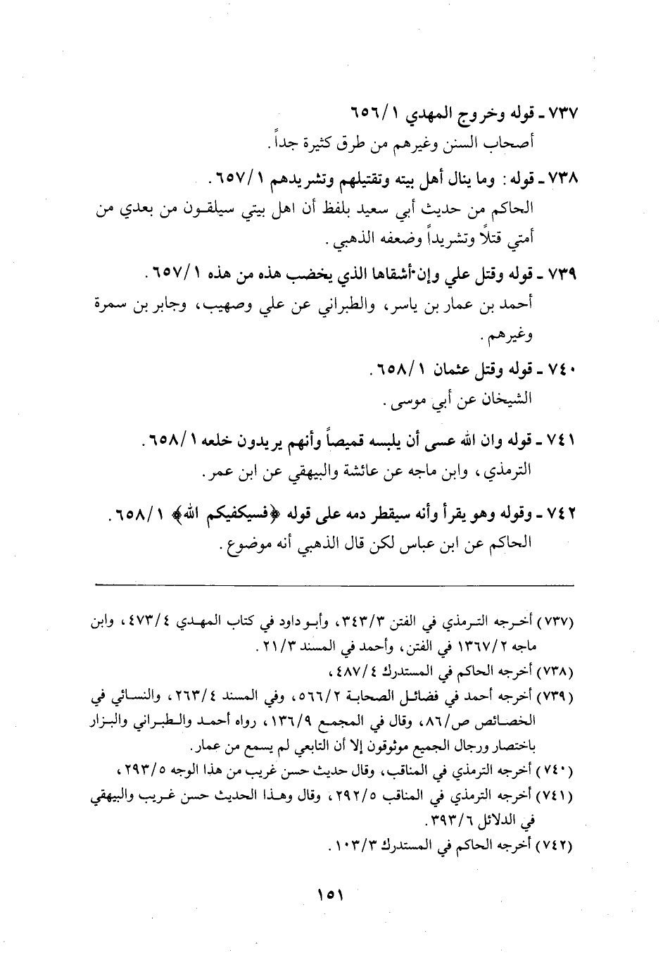 (737) أخرجه الترمذي في الفتن 3/ 343، وأبو داود في كتاب المهدي 4/ 473، وابن ماجه 2/ 1367 في الفتن، وأحمد في المسند 3/ 21.