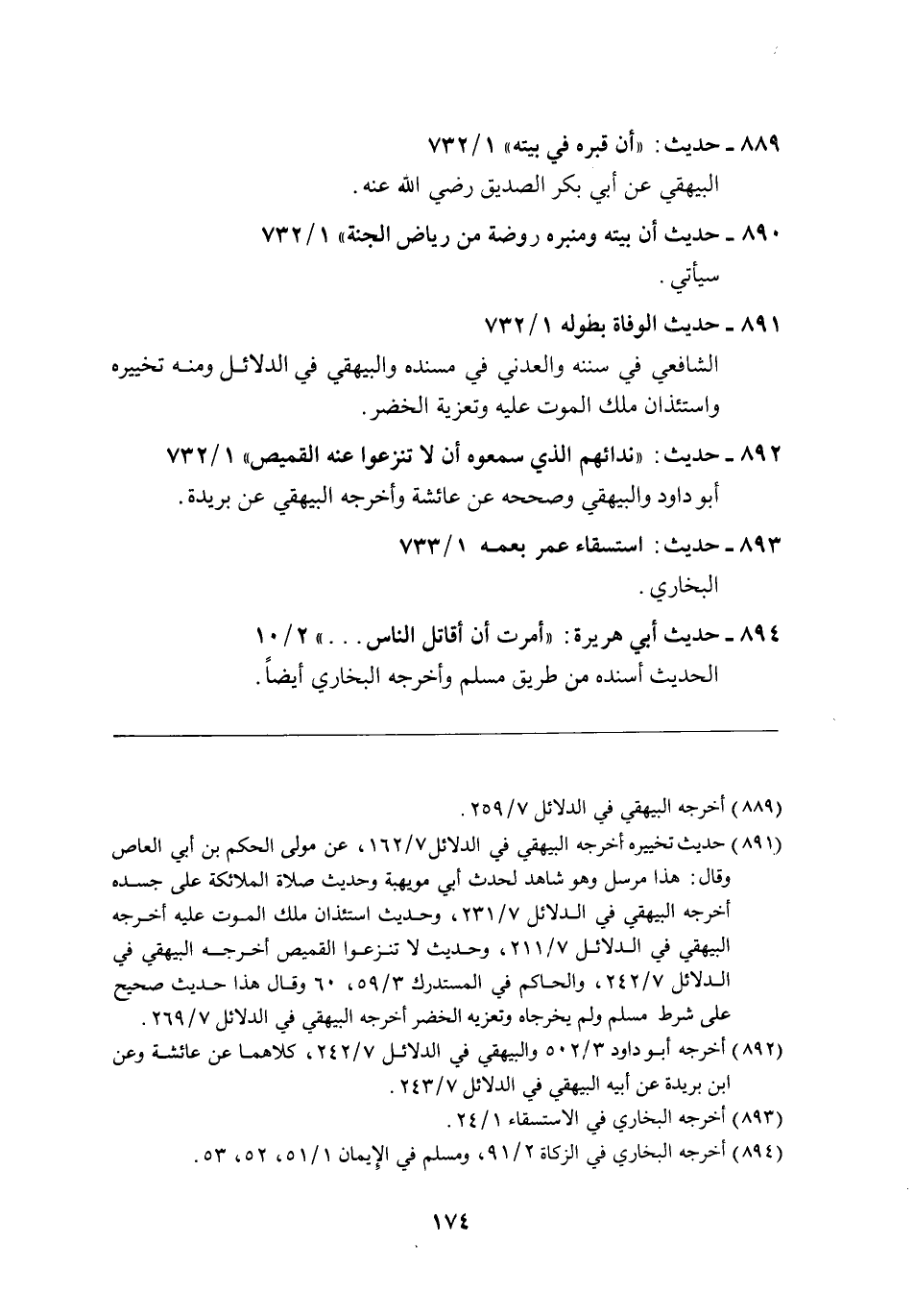 (891) حديث تخييره أخرجه البيهقي في الدلائل 7/ 162، عن مولى الحكم بن أبي العاص وقال: هذا مرسل وهو شاهد لحدث أبي مويهبة وحديث صلاة الملائكة على جسده أخرجه البيهقي في الدلائل 7/ 231، وحديث استئذان ملك الموت عليه أخرجه البيهقي في الدلائل 7/ 211، وحديث لا تنزعوا القميص أخرجه البيهقي في الدلائل 7/ 242، والحاكم في المستدرك 3/ 59، 60 وقال هذا حديث صحيح على شرط مسلم ولم يخرجاه وتعزيه الخضر أخرجه البيهقي في الدلائل 7/ 269.