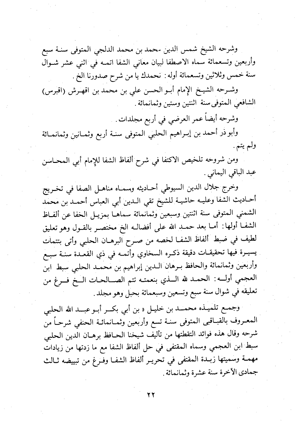 وخرج جلال الدين السيوطي أحاديثه وسماه مناهل الصفا في تخريج أحاديث الشفا وعليه حاشية للشيخ تقي الدين أبي العباس أحمد بن محمد الشمني المتوفى لسنة اثنتين وسبعين وثمانمائة سماها بمزيل الخفا عن ألفاظ الشفا أولها: أما بعد حمد الله على أفضاله الخ مختصر بالقول وهو تعليق لطيف في ضبط ألفاظ الشفا لخصه من صرح البرهان الحلبي وأتى بتتمات يسيرة فيها تحقيفات دقيقة ذكره السخاوي وأتمه في ذي القعدة سنة سبع وأربعين وثمانمائة والحافظ برهان الدين إبراهيم بن محمد الحلبي سبط ابن العجمي أوله: الحمد لله الذي بنعمته تتم الصالحات الخ فرغ من تعليقه في شوال سنة سبع وتسعين وسبعمائة بحبل وهو مجلد.