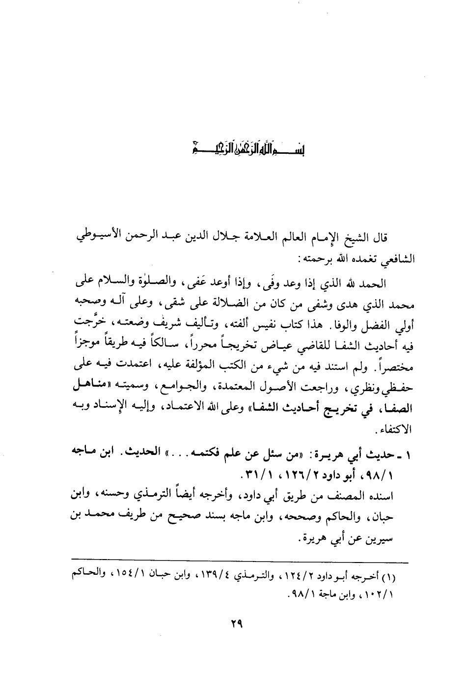 الحمد لله الذي إذا وعد وفَى، وإذا أوعد عَفى، والصلاة والسلام على محمد الذي هدى وشفى من كان من الضلالة على شقى، وعلى آله وصحبه أولي الفضل والوفا. هذا كتاب نفيس ألفته، وتأليف شريف وضعته، خرَّجت فيه أحاديث الشفا للقاضي عياض تخريجًا محررًا، سالكًا فيه طريقًا موجزًا مختصرًا. ولم أستند فيه من شيء من الكتب المؤلفة عليه، اعتمدت فيه على حفظي ونظري، وراجعت الأصول المعتمدة، والجوامع، وسميته "مناهل الصفا، في تخريج أحاديث الشفا" وعلى الله الاعتماد، وإليه الإِسناد وبه الاكتفاء.