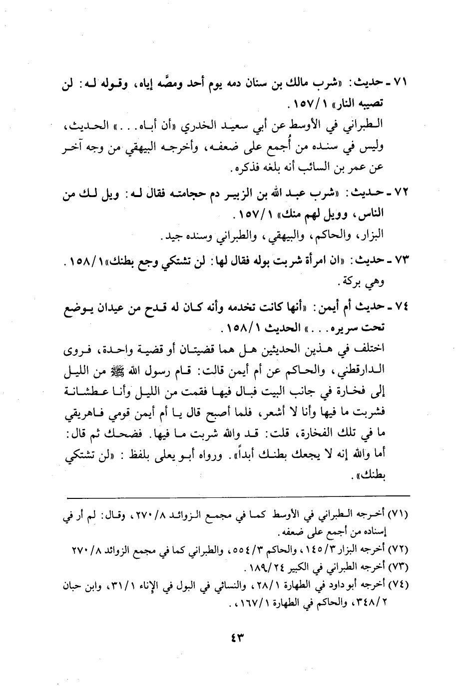 73 - حديث: "ان امرأة شربت بوله فقال لها: لن تشتكي وجع بطنك" 1/ 158.