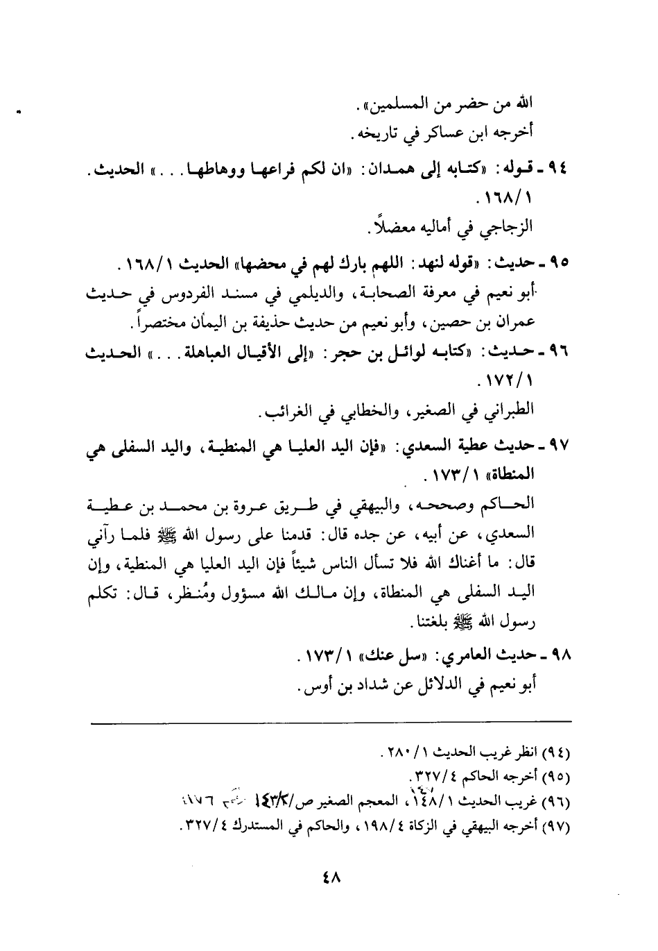 96 - حديث: "كتابه لوائل بن حجر: "إلى الأقيال العباهلة ... " الحديث 1/ 172.
