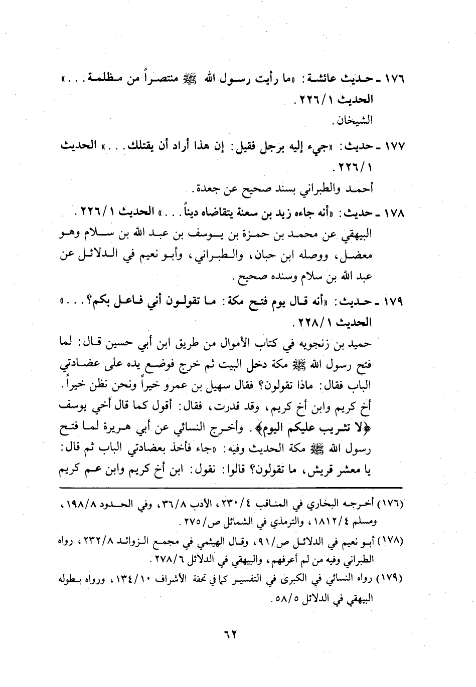 176 - حديث عائشة: "ما رأيت رسول الله - صلى الله عليه وسلم - منتصرًا من مظلمة ... " الحديث 1/ 226.