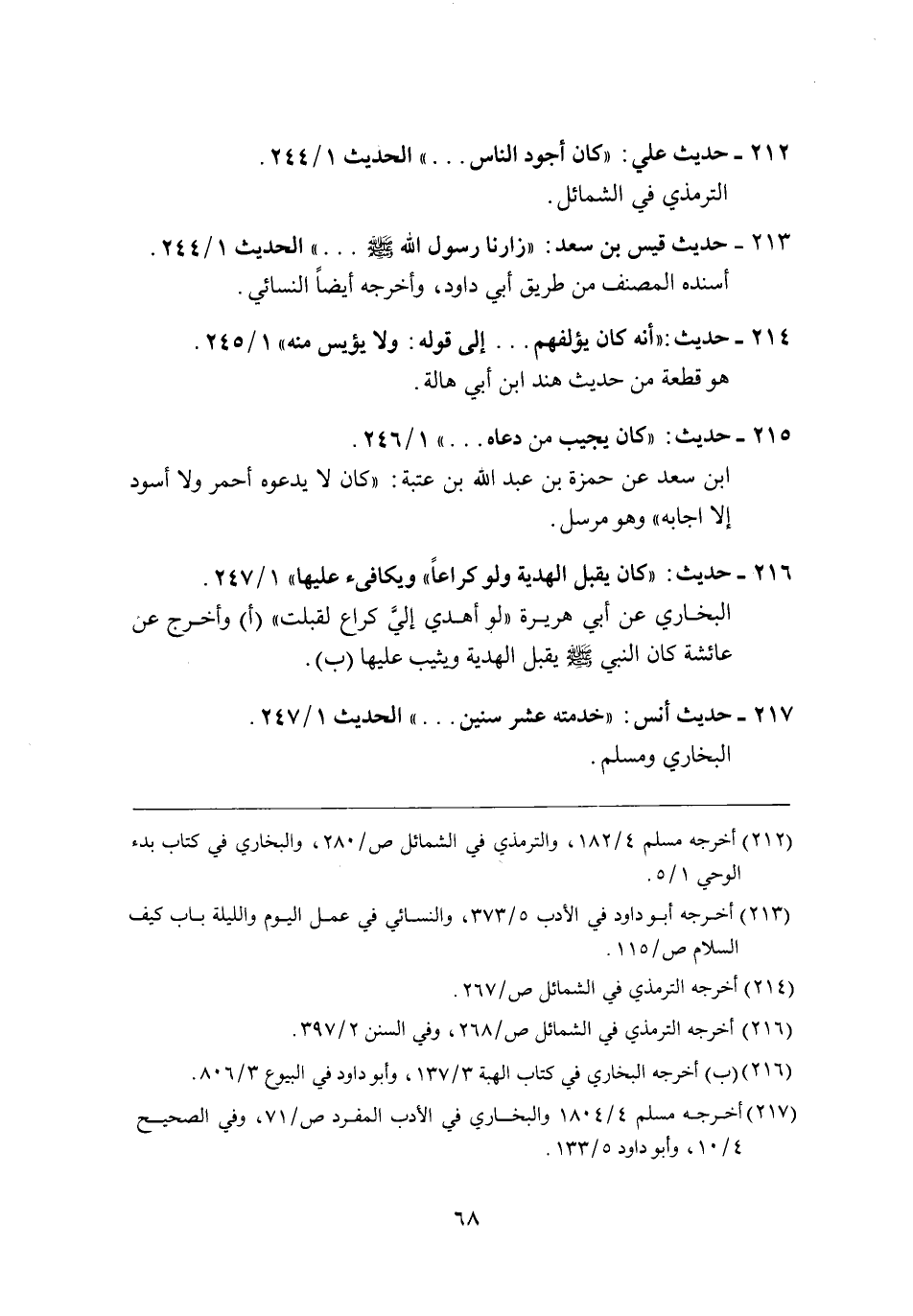 216 - حديث: "كان يقبل الهدية ولو كراعًا ويكافىء عليها" 1/ 247.