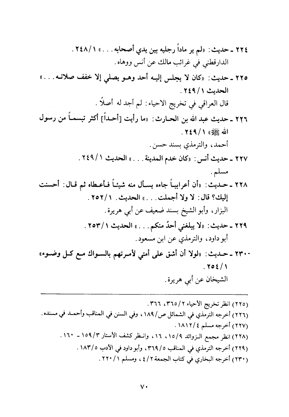 226 - حديث عبد الله بن الحارث: "ما رأيت [أحدًا] أكثر تبسمًا من رسول الله - صلى الله عليه وسلم - " 1/ 249.
