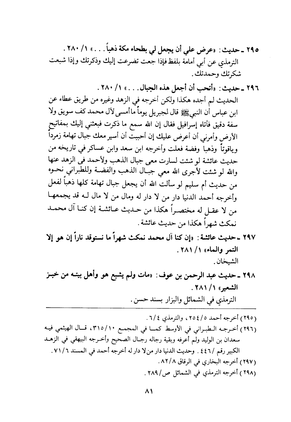295 - حديث: "عرض علي أن يجعل لي بطحاء مكة ذهبًا ... " 1/ 280.
