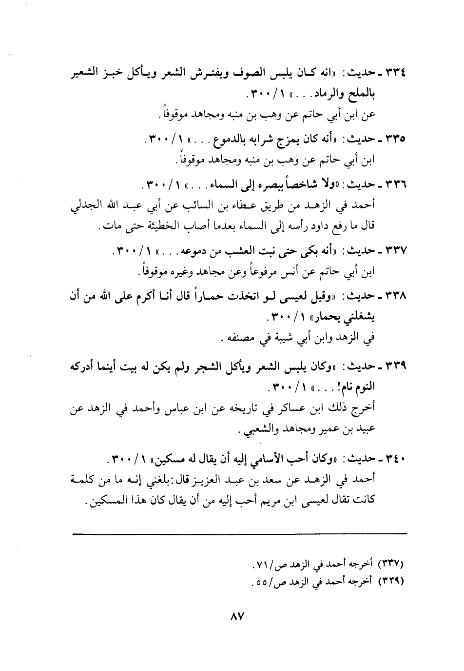 339 - حديث: "وكان يلبس الشعر ويأكل الشجر ولم يكن له بيت أينما أدركه النوم نام! ... " 1/ 300.